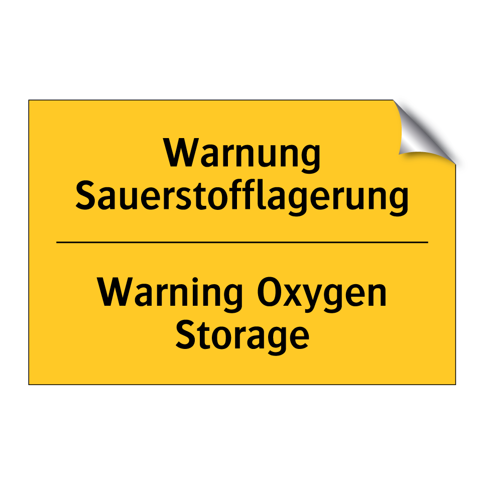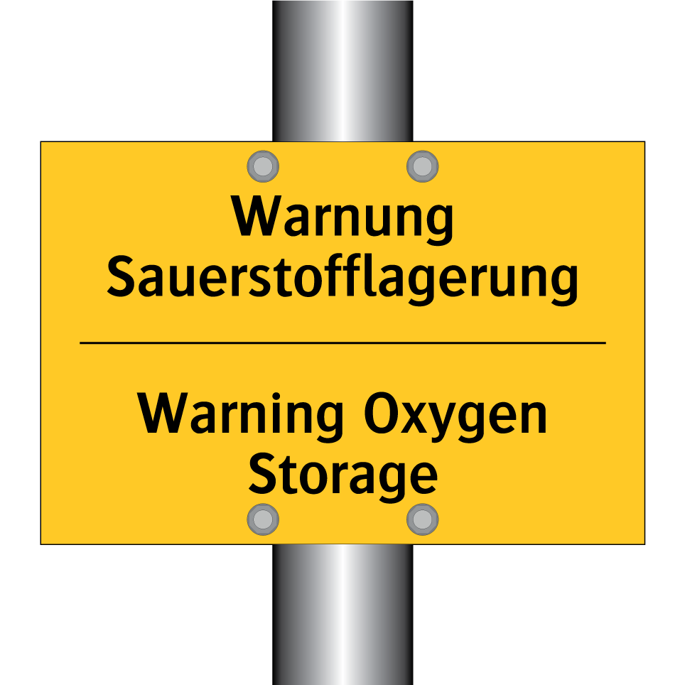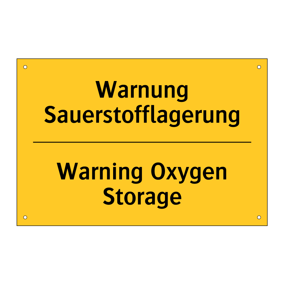 Zweisprachiges Warnschild mit deutschem Text Warnung Sauerstofflagerung und englischem Text Warning Oxygen Storage