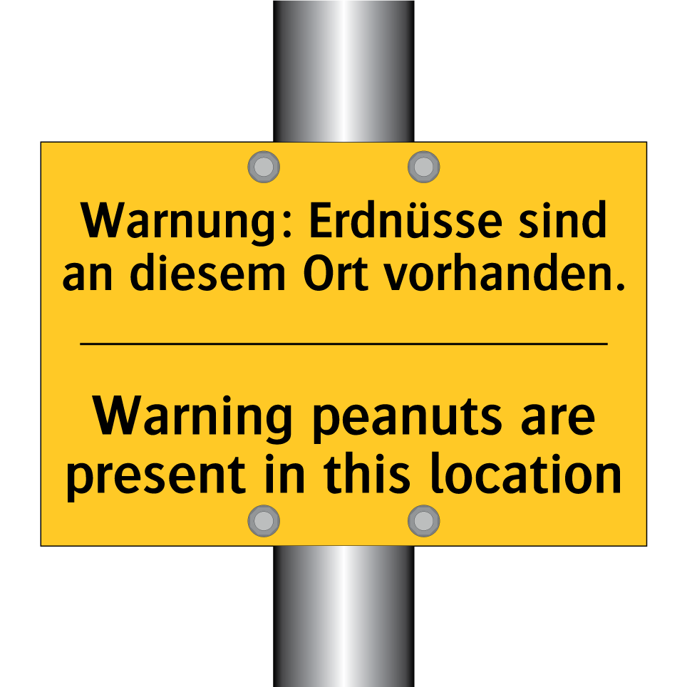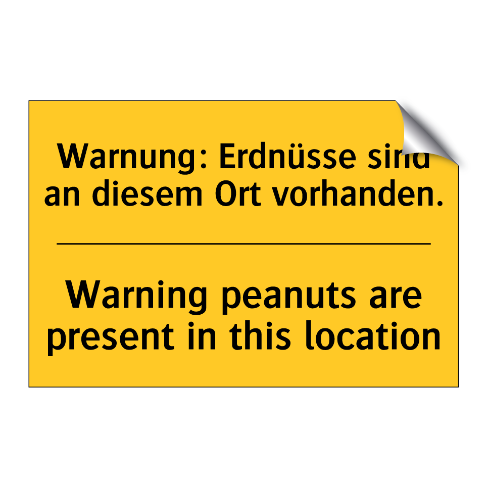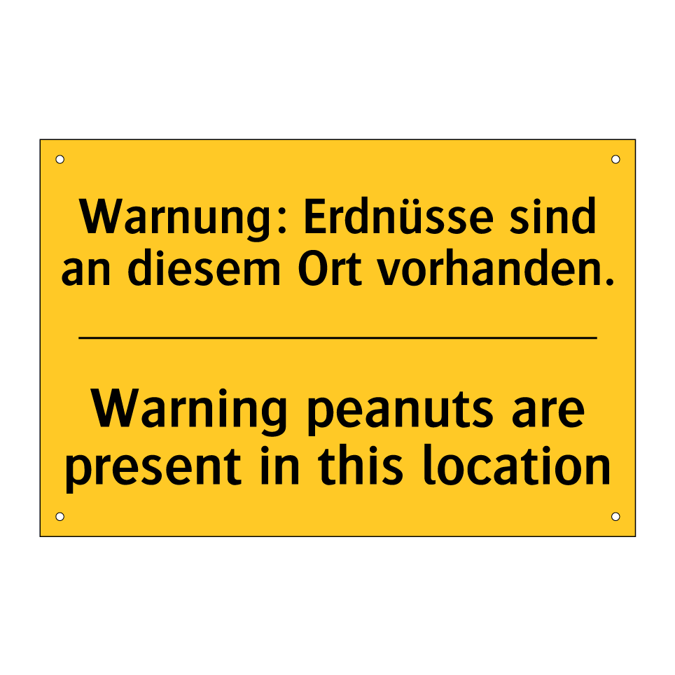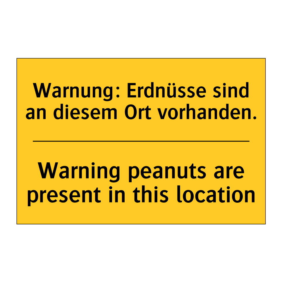 Zweisprachiges Warnschild mit deutschem Text Warnung: Erdnüsse sind an diesem Ort vorhanden. und englischem Text Warning peanuts are present in this location