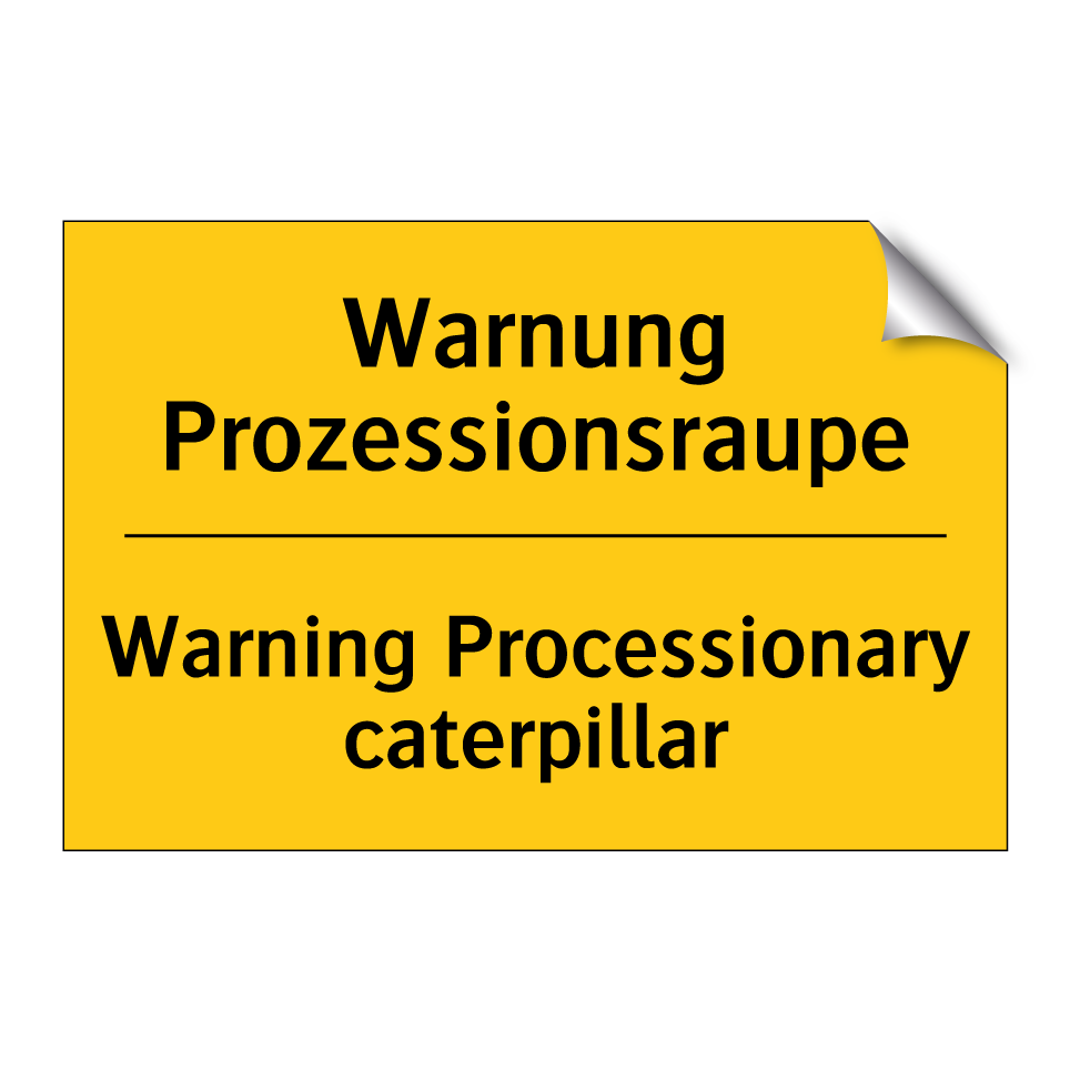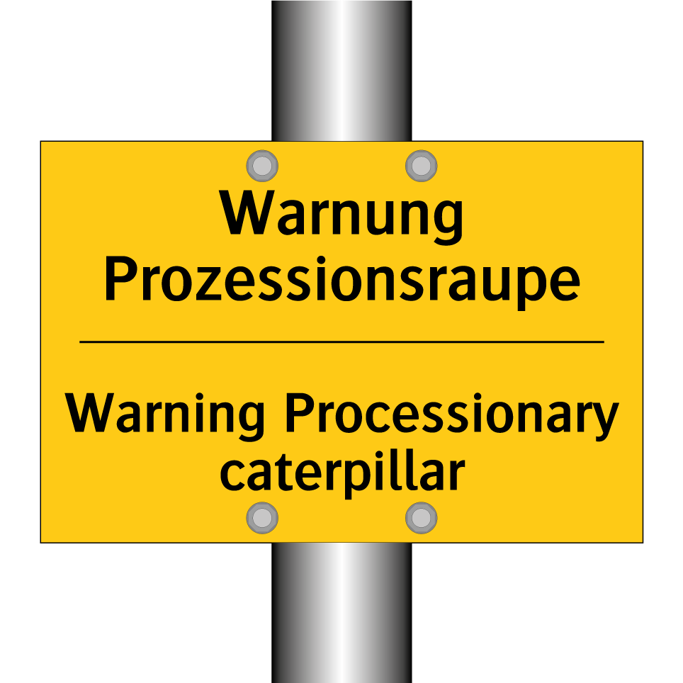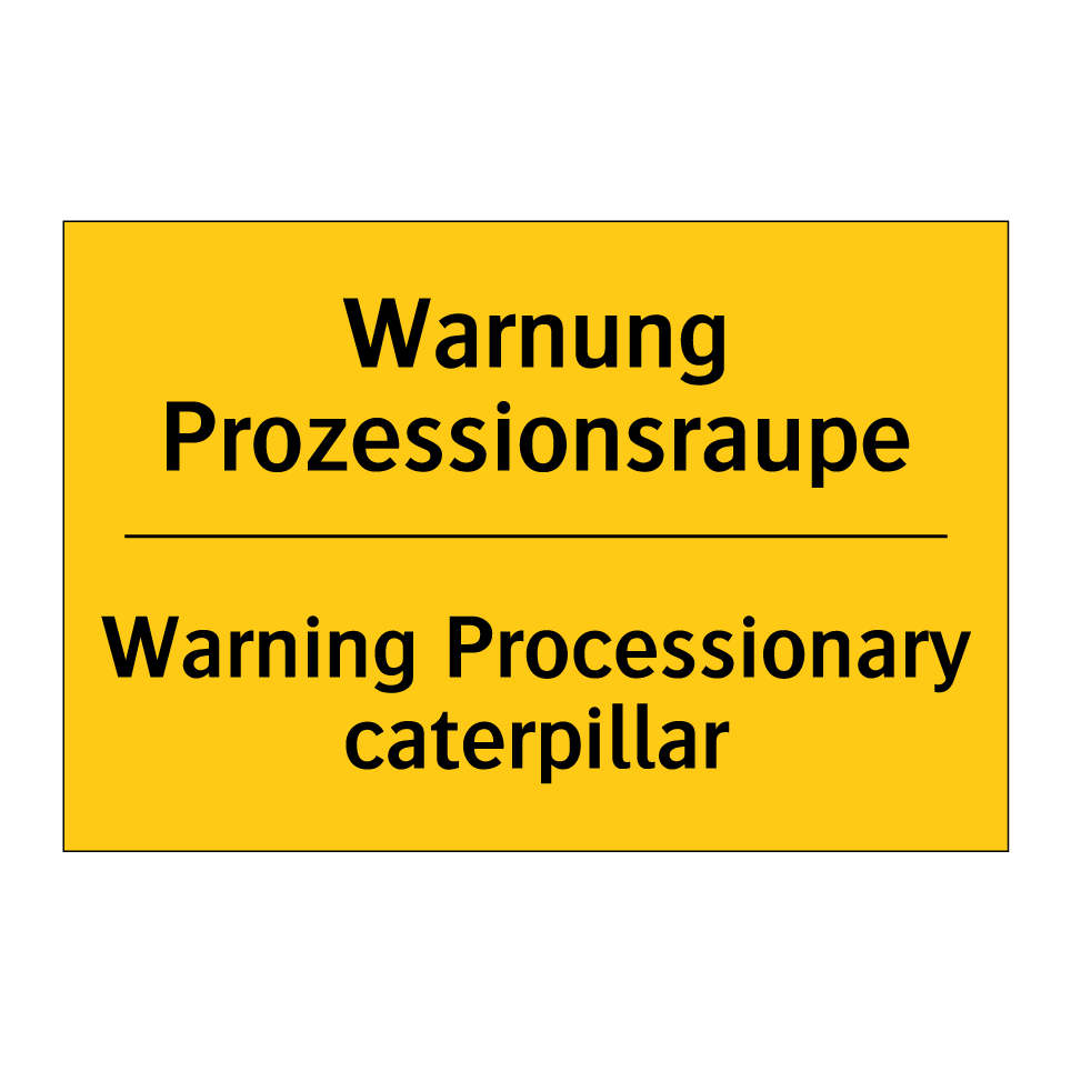 Zweisprachiges Warnschild mit deutschem Text Warnung Prozessionsraupe und englischem Text Warning Processionary caterpillar