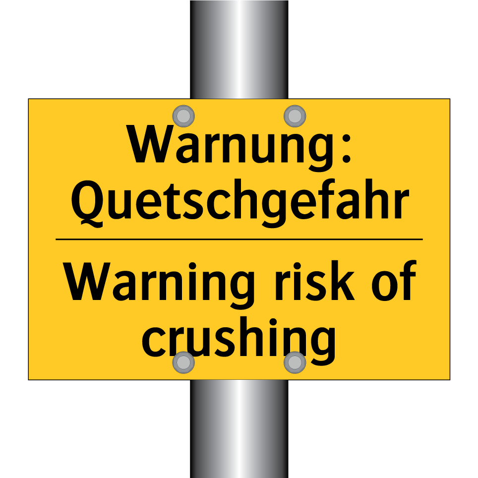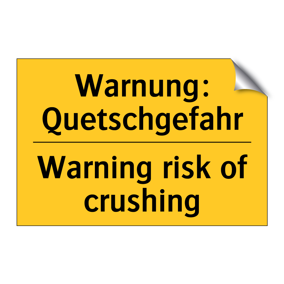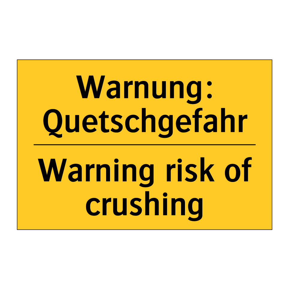 Zweisprachiges Warnschild mit deutschem Text Warnung: Quetschgefahr und englischem Text Warning risk of crushing