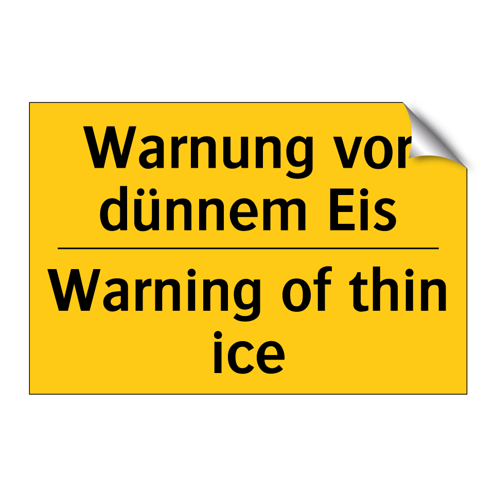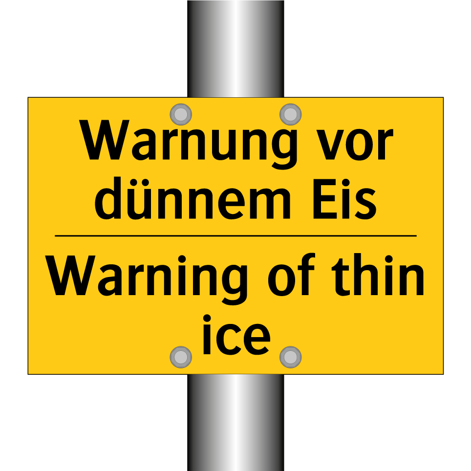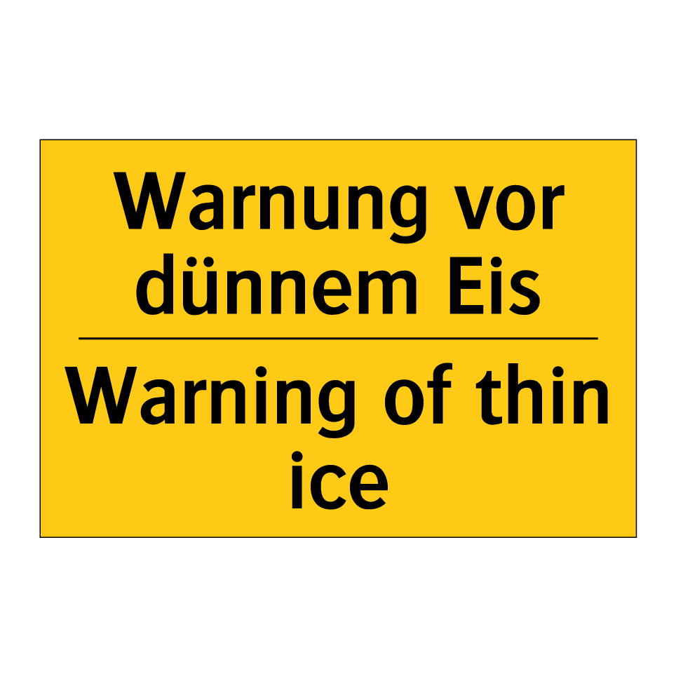 Zweisprachiges Warnschild mit deutschem Text Warnung vor dünnem Eis und englischem Text Warning of thin ice