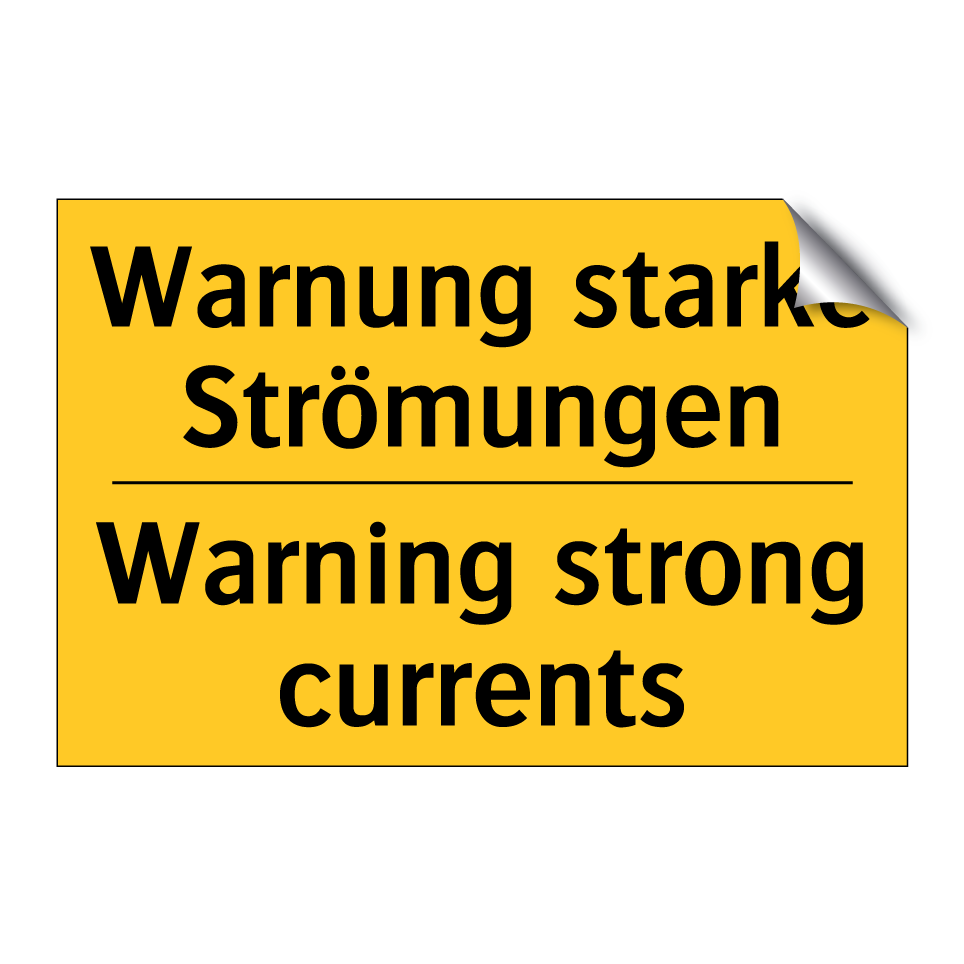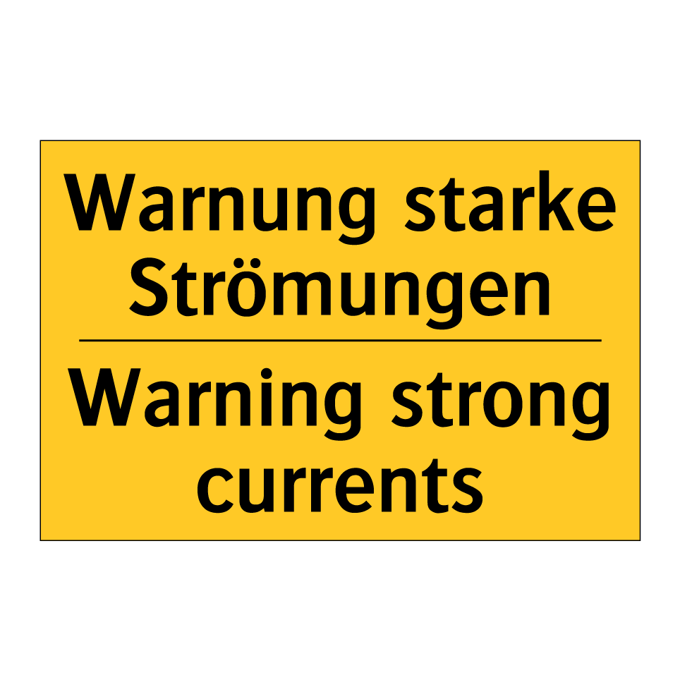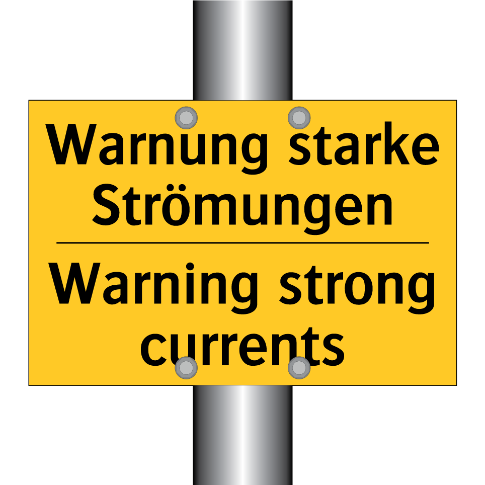 Zweisprachiges Warnschild mit deutschem Text Warnung starke Strömungen und englischem Text Warning strong currents