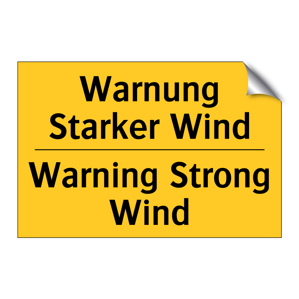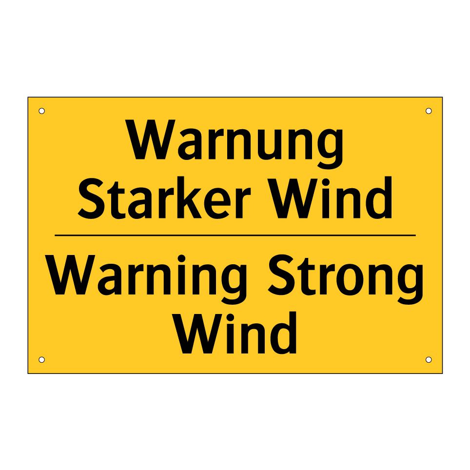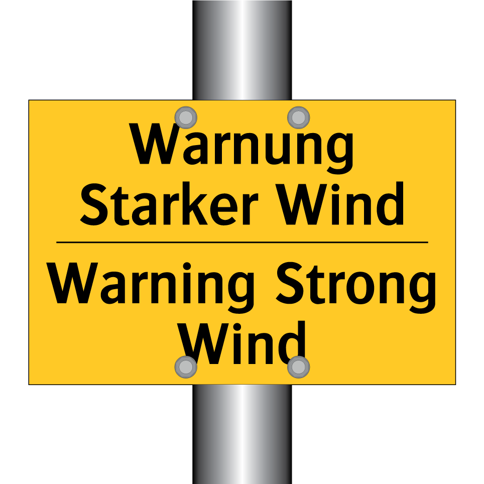 Zweisprachiges Warnschild mit deutschem Text Warnung Starker Wind und englischem Text Warning Strong Wind