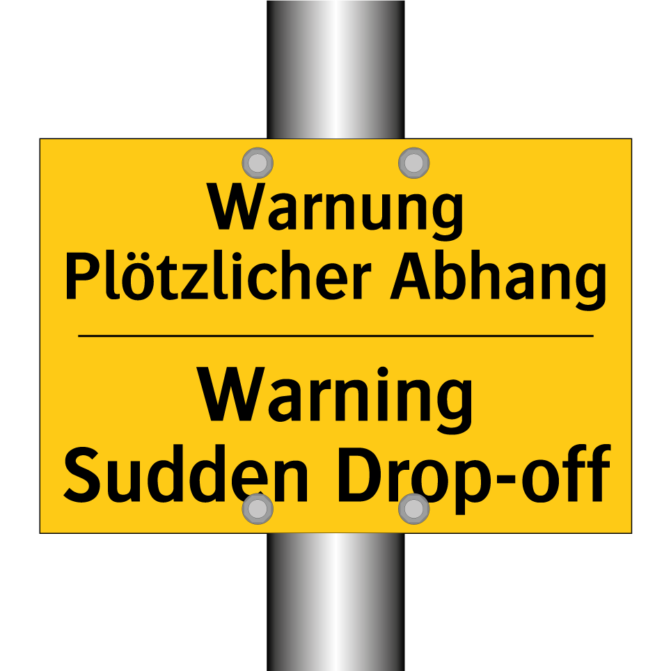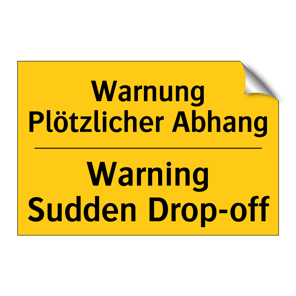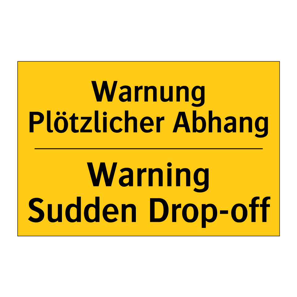 Zweisprachiges Warnschild mit deutschem Text Warnung Plötzlicher Abhang und englischem Text Warning Sudden Drop-off