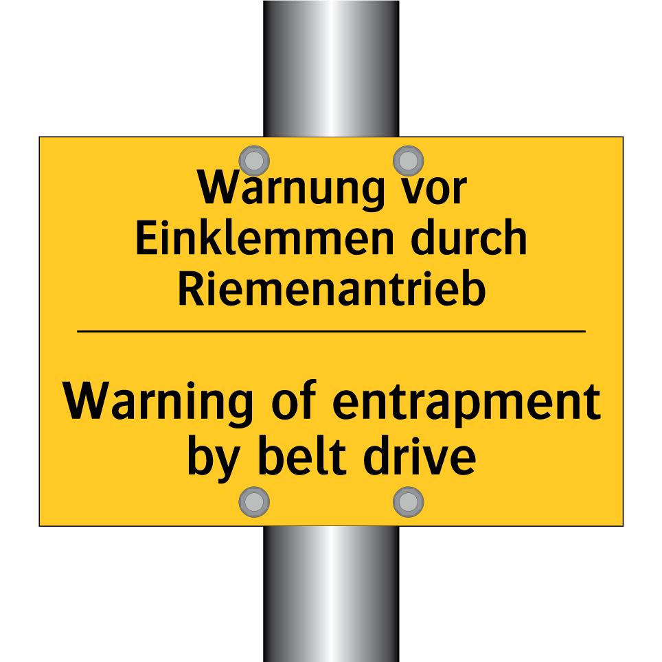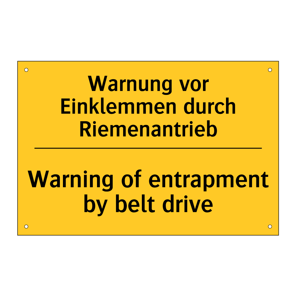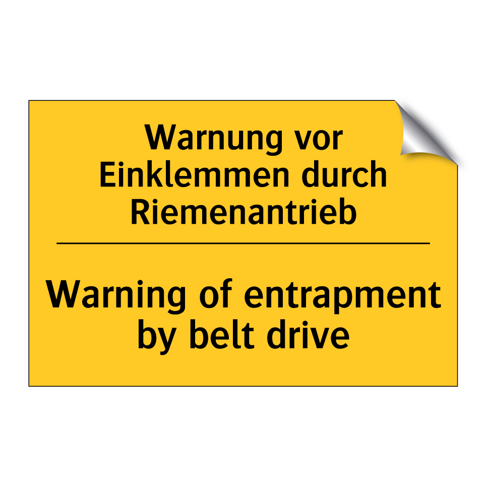 Zweisprachiges Warnschild mit deutschem Text Warnung vor Einklemmen durch Riemenantrieb und englischem Text Warning of entrapment by belt drive