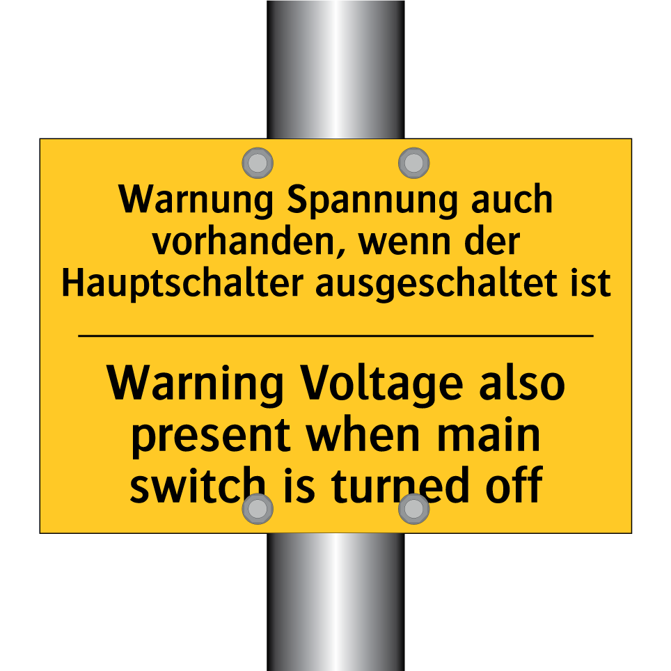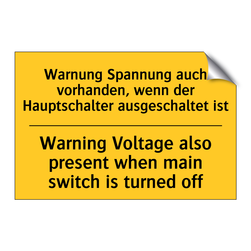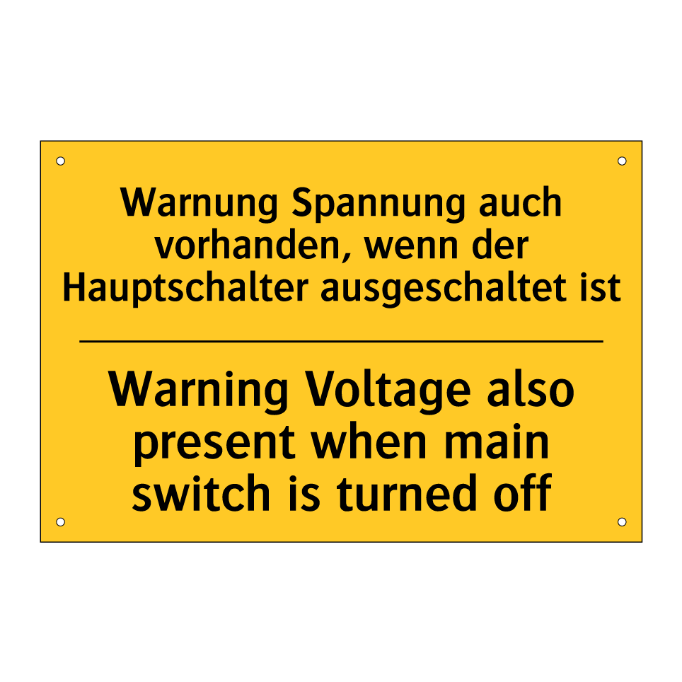 Zweisprachiges Warnschild mit deutschem Text Warnung Spannung auch vorhanden, wenn der Hauptschalter ausgeschaltet ist und englischem Text Warning Voltage also present when main switch is turned off
