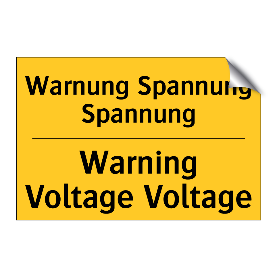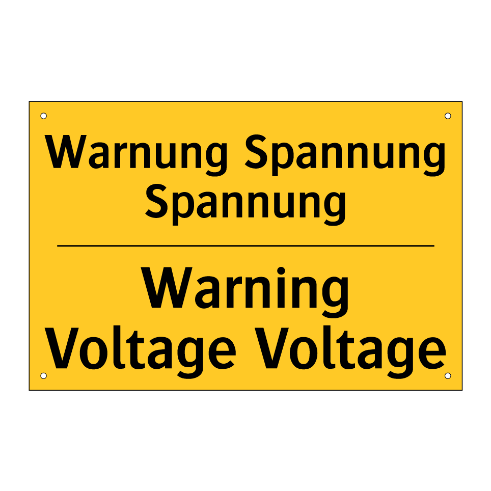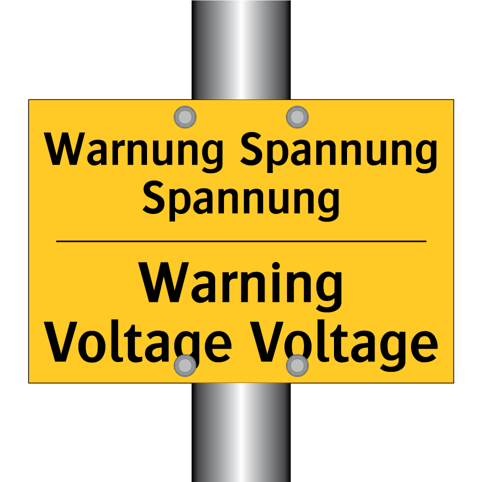 Zweisprachiges Warnschild mit deutschem Text Warnung Spannung Spannung und englischem Text Warning Voltage Voltage
