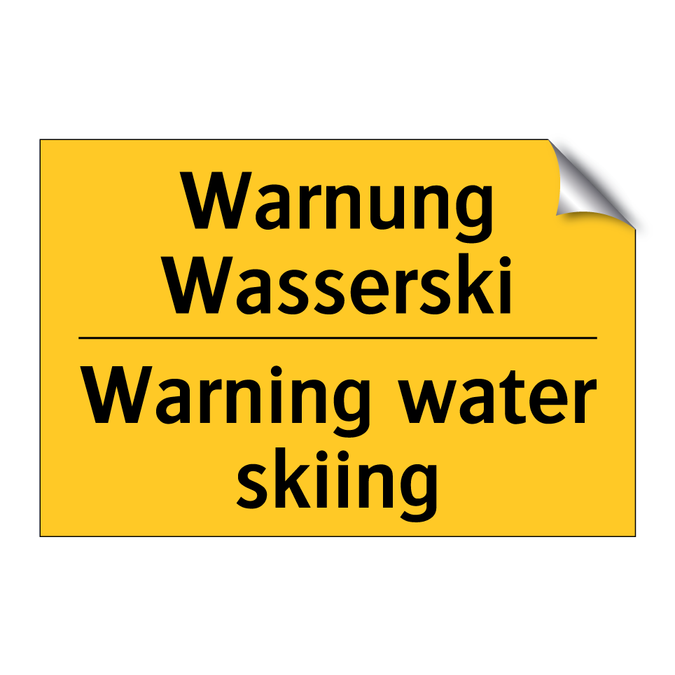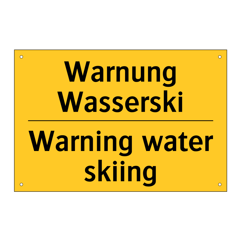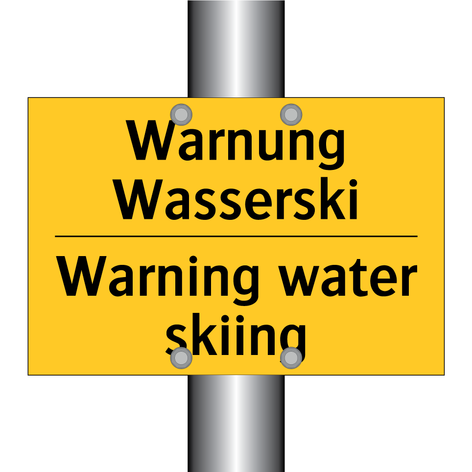 Zweisprachiges Warnschild mit deutschem Text Warnung Wasserski und englischem Text Warning water skiing