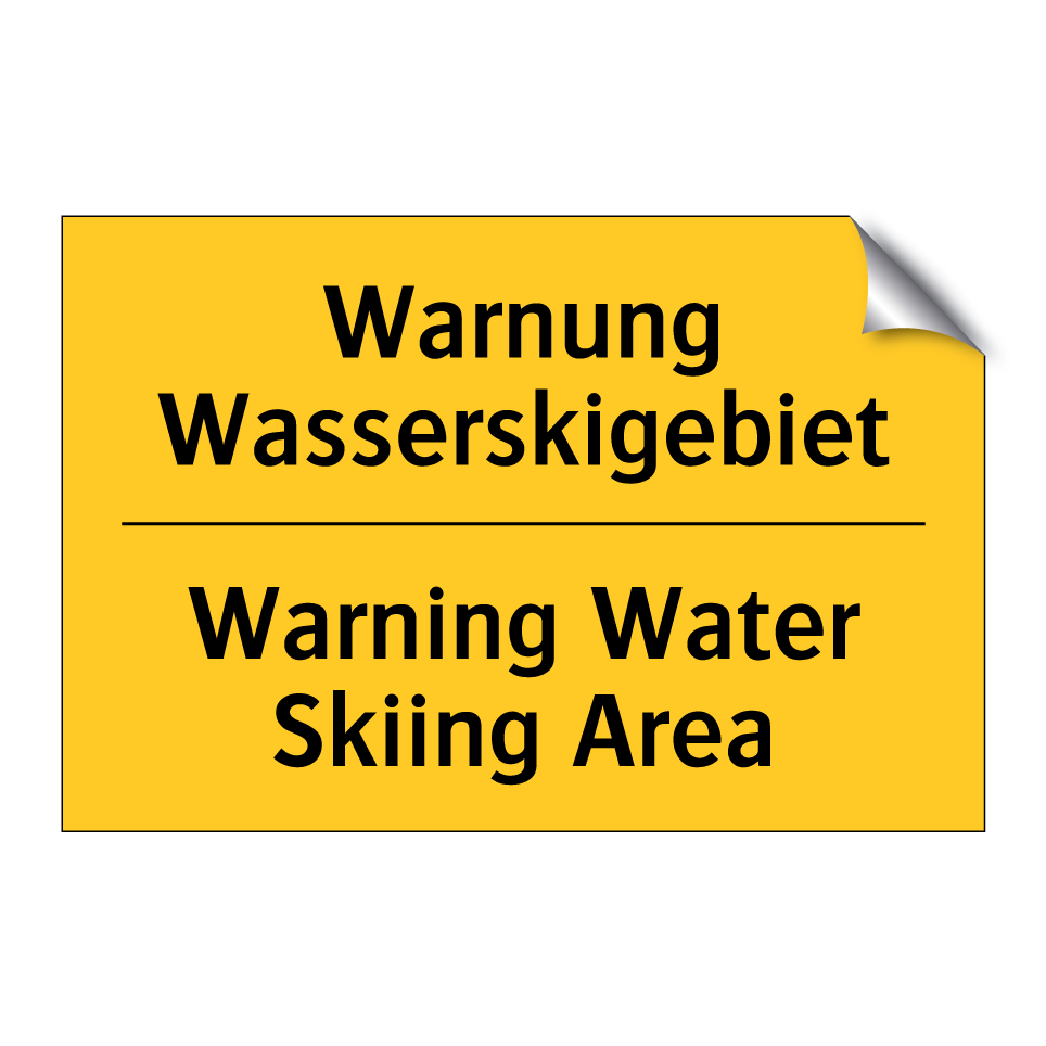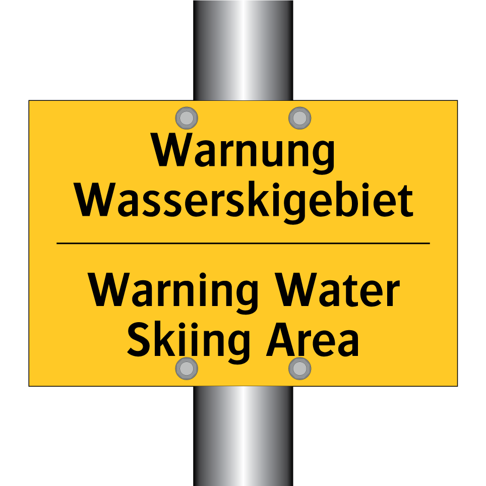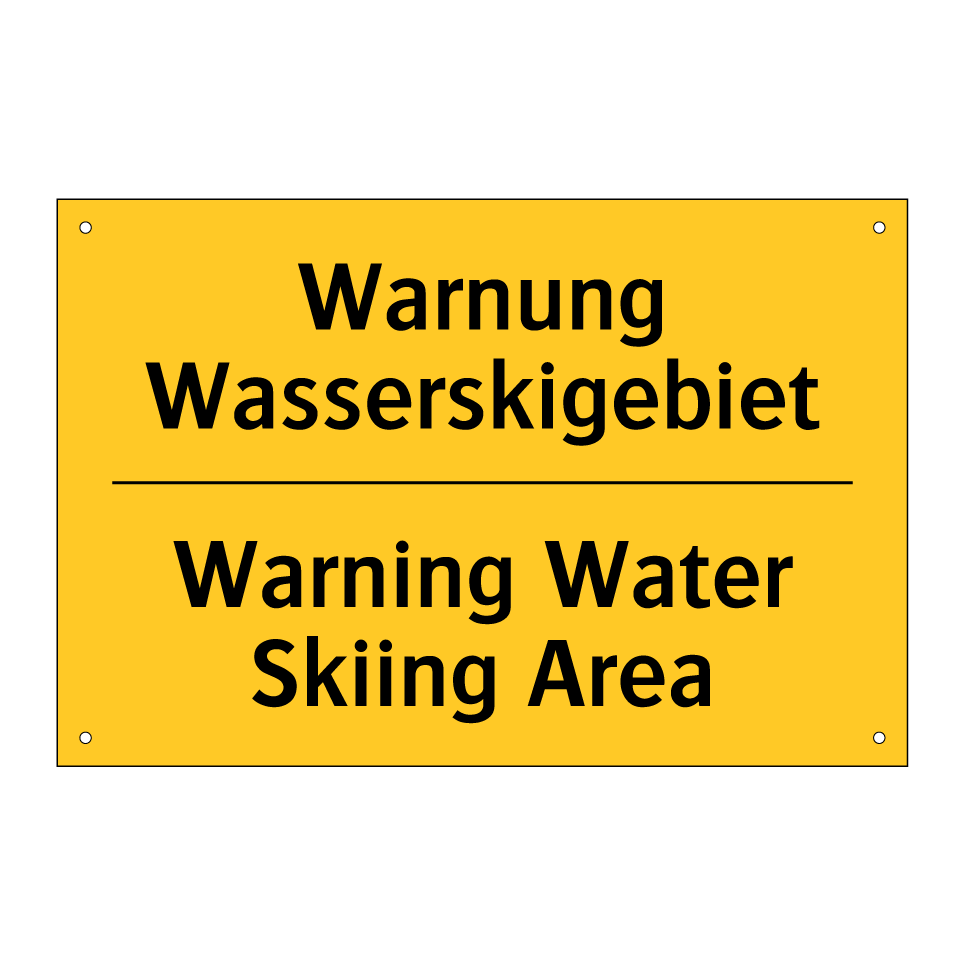 Zweisprachiges Warnschild mit deutschem Text Warnung Wasserskigebiet und englischem Text Warning Water Skiing Area