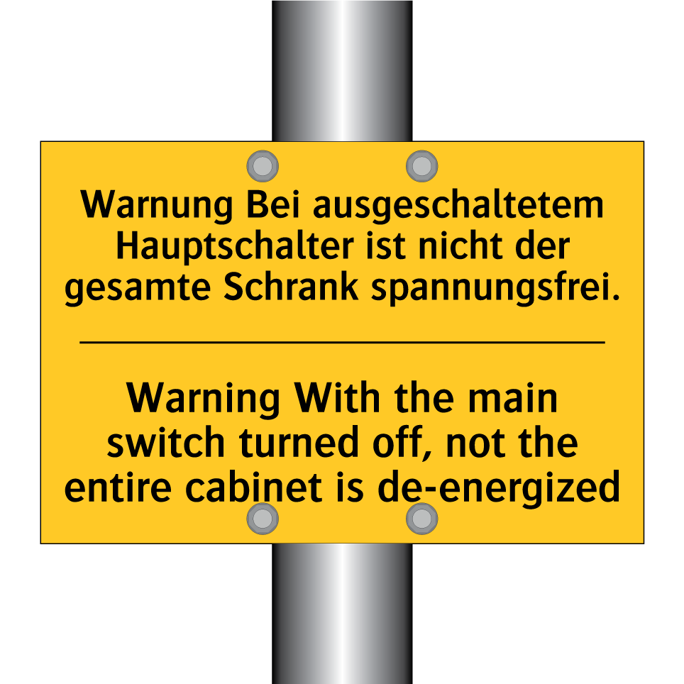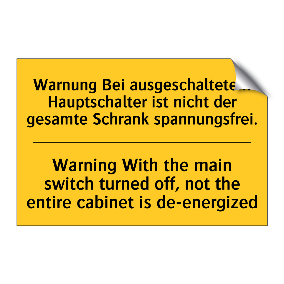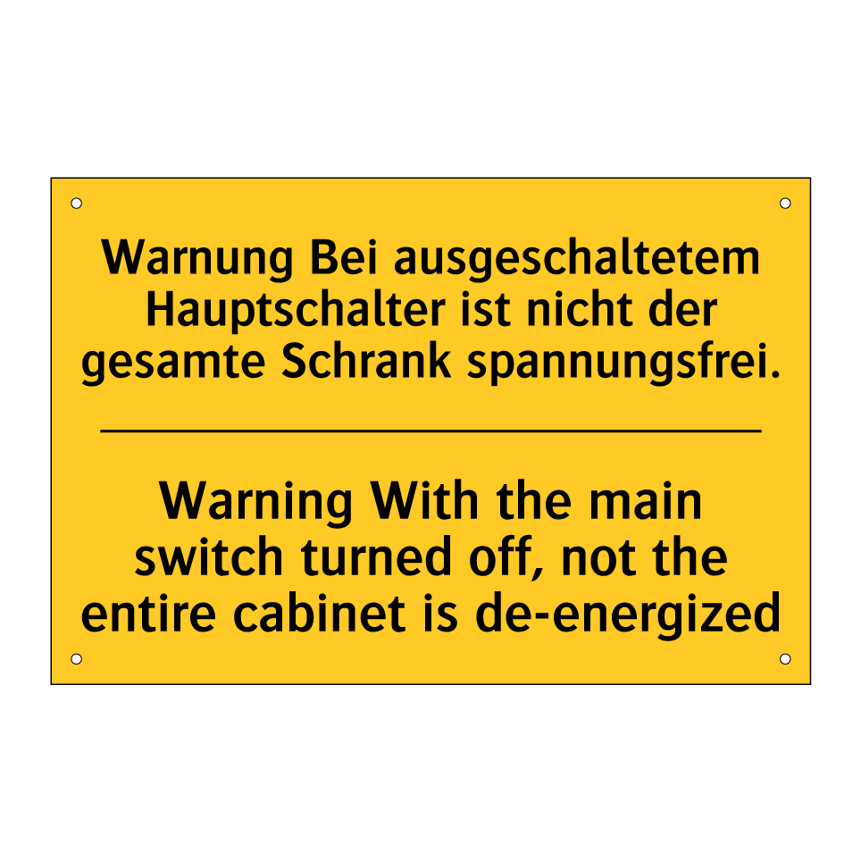 Zweisprachiges Warnschild mit deutschem Text Warnung Bei ausgeschaltetem Hauptschalter ist nicht der gesamte Schrank spannungsfrei. und englischem Text Warning With the main switch turned off, not the entire cabinet is de-energized