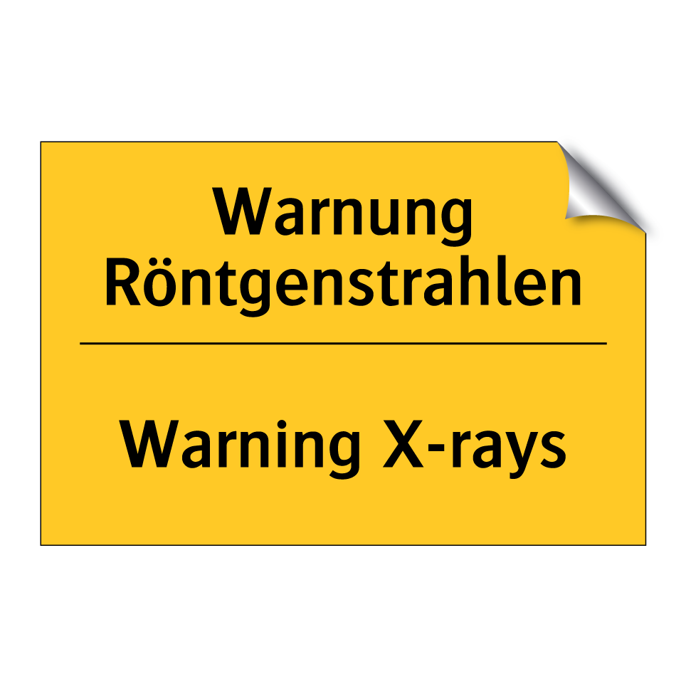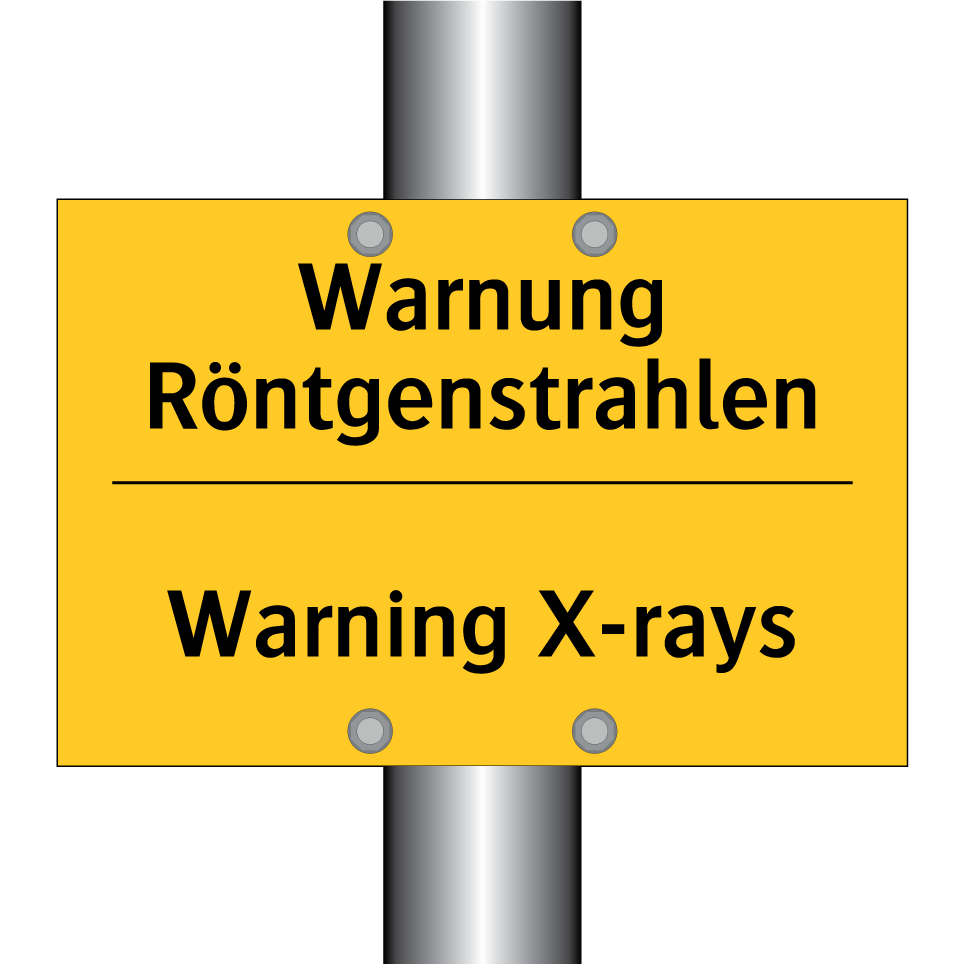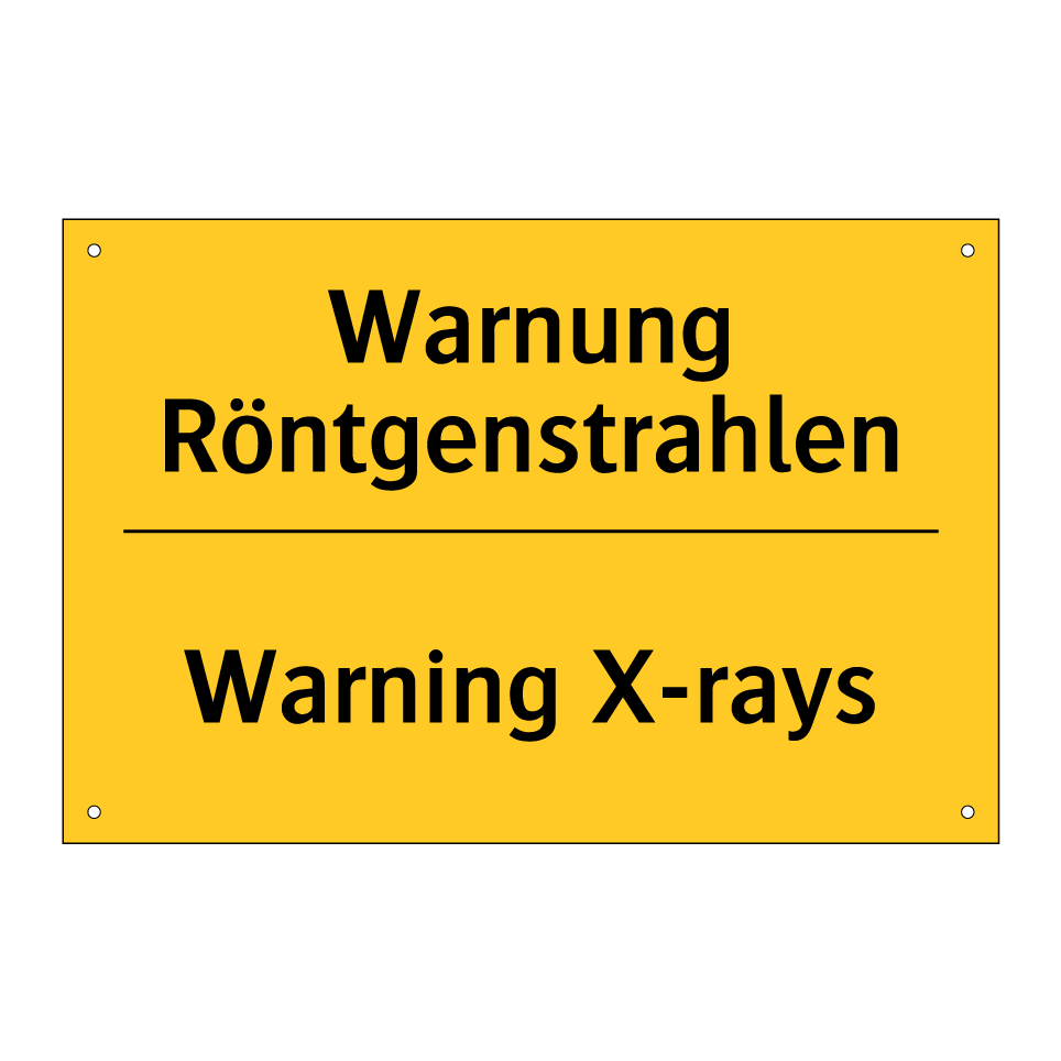 Zweisprachiges Warnschild mit deutschem Text Warnung Röntgenstrahlen und englischem Text Warning X-rays