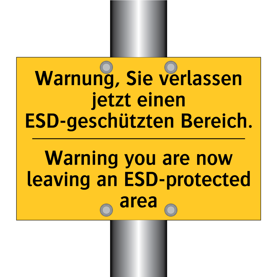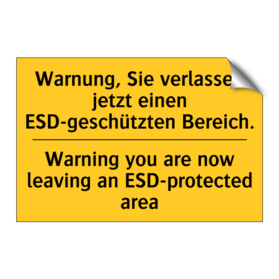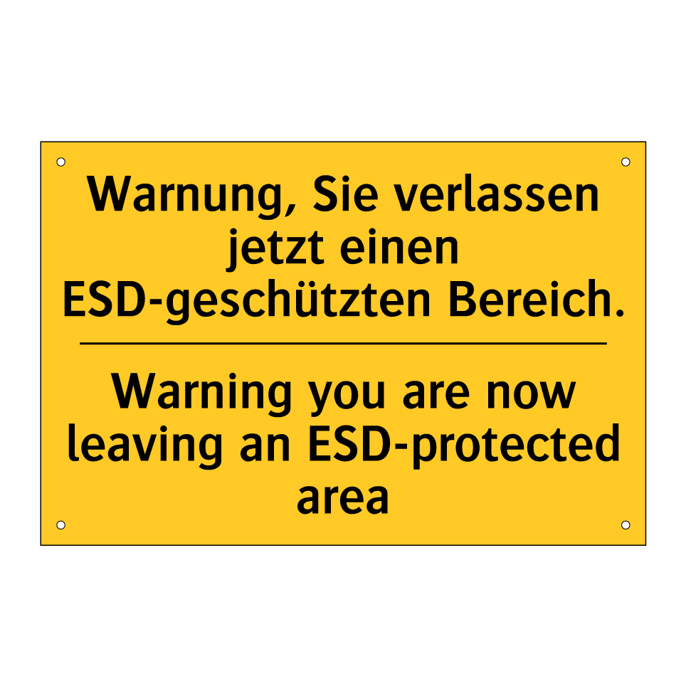 Zweisprachiges Warnschild mit deutschem Text Warnung, Sie verlassen jetzt einen ESD-geschützten Bereich. und englischem Text Warning you are now leaving an ESD-protected area