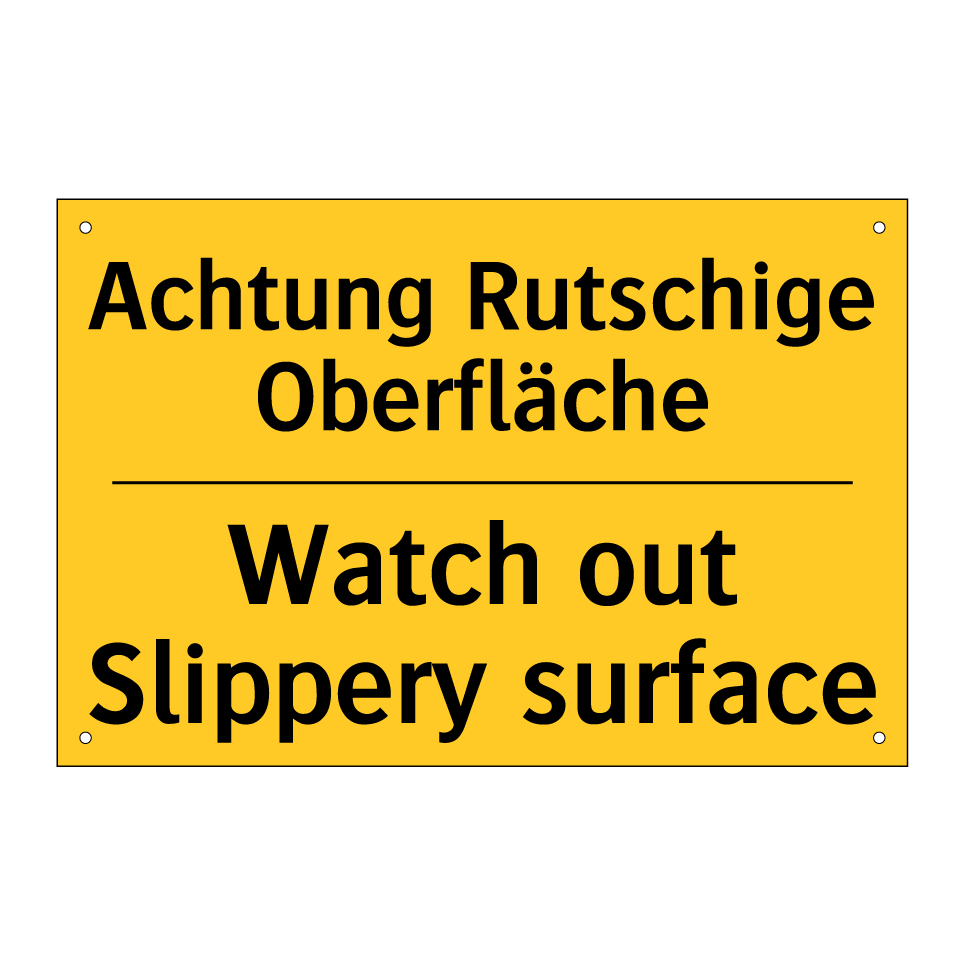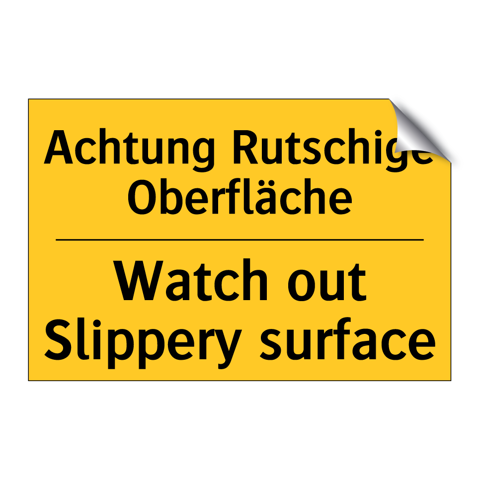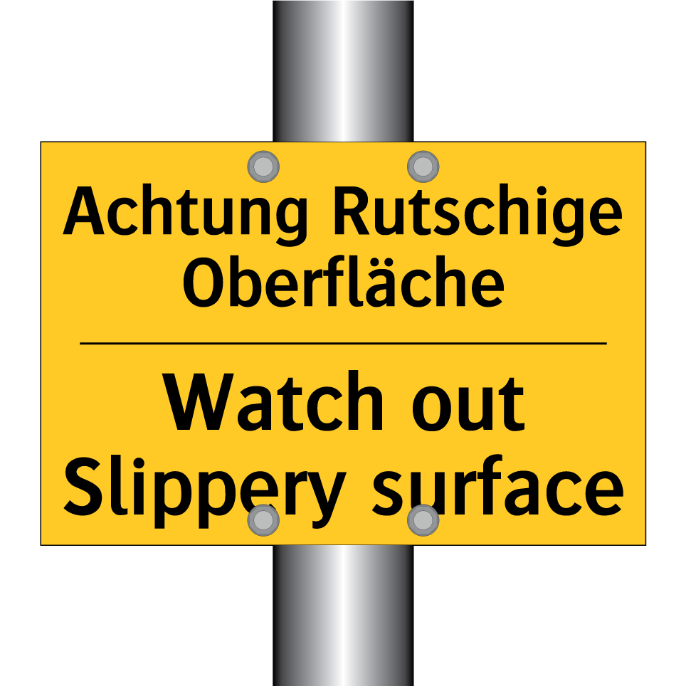 Zweisprachiges Warnschild mit deutschem Text Achtung Rutschige Oberfläche und englischem Text Watch out Slippery surface