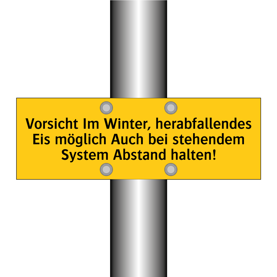 Warnschild mit dem Text Vorsicht Im Winter, herabfallendes Eis möglich Auch bei stehendem System Abstand halten!