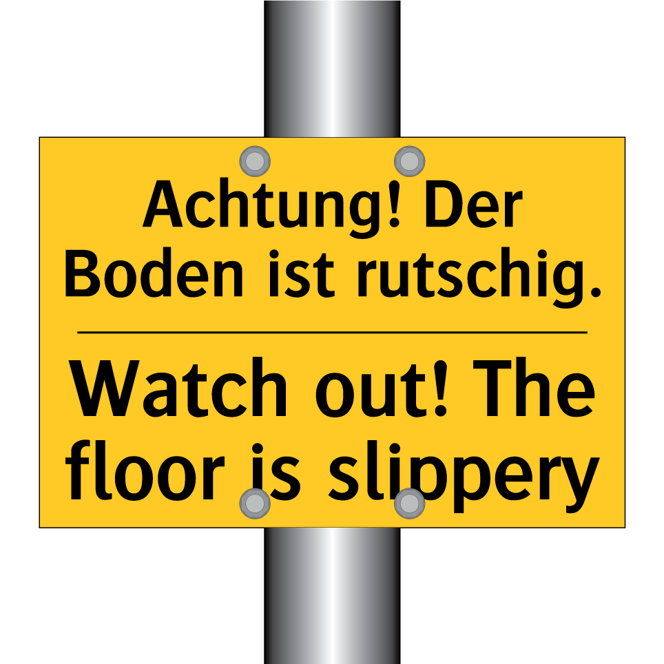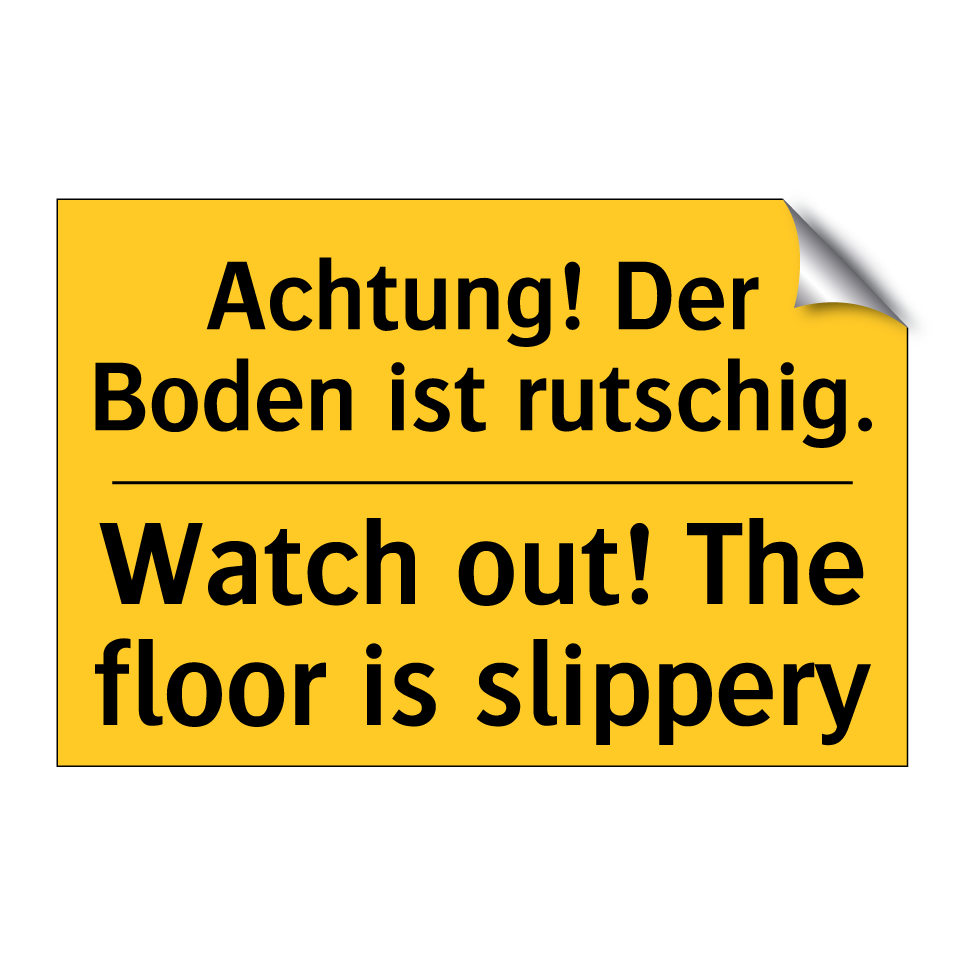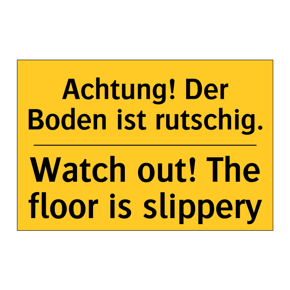 Zweisprachiges Warnschild mit deutschem Text Achtung! Der Boden ist rutschig. und englischem Text Watch out! The floor is slippery