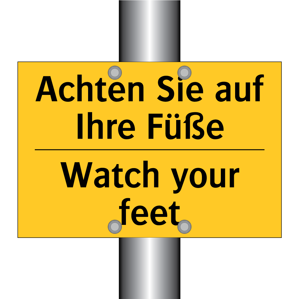 Zweisprachiges Warnschild mit deutschem Text Achten Sie auf Ihre Füße und englischem Text Watch your feet