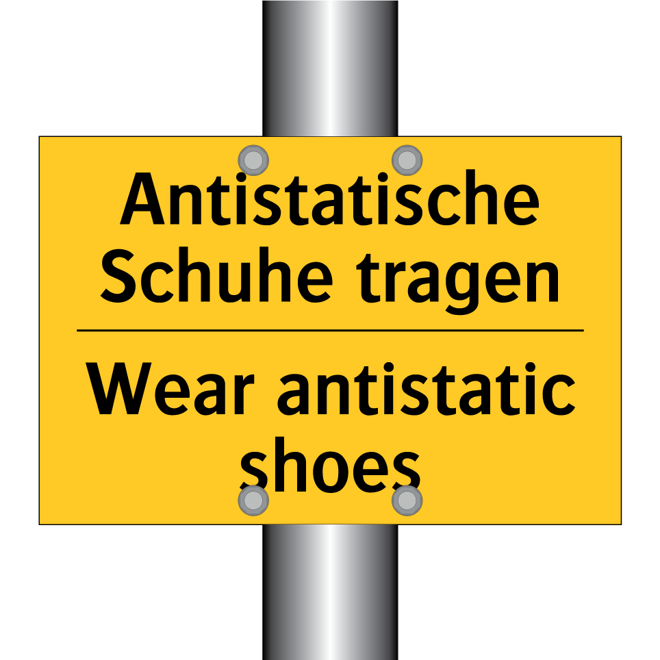 Zweisprachiges Warnschild mit deutschem Text Antistatische Schuhe tragen und englischem Text Wear antistatic shoes