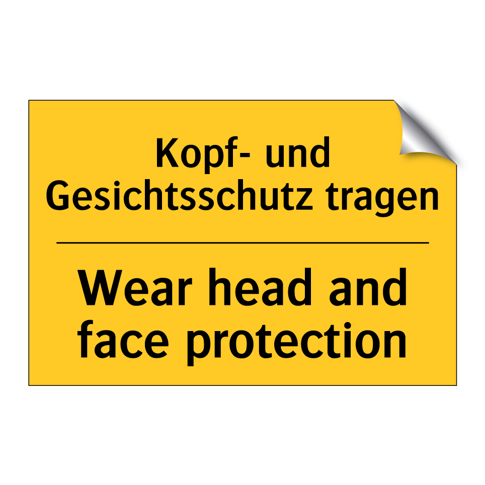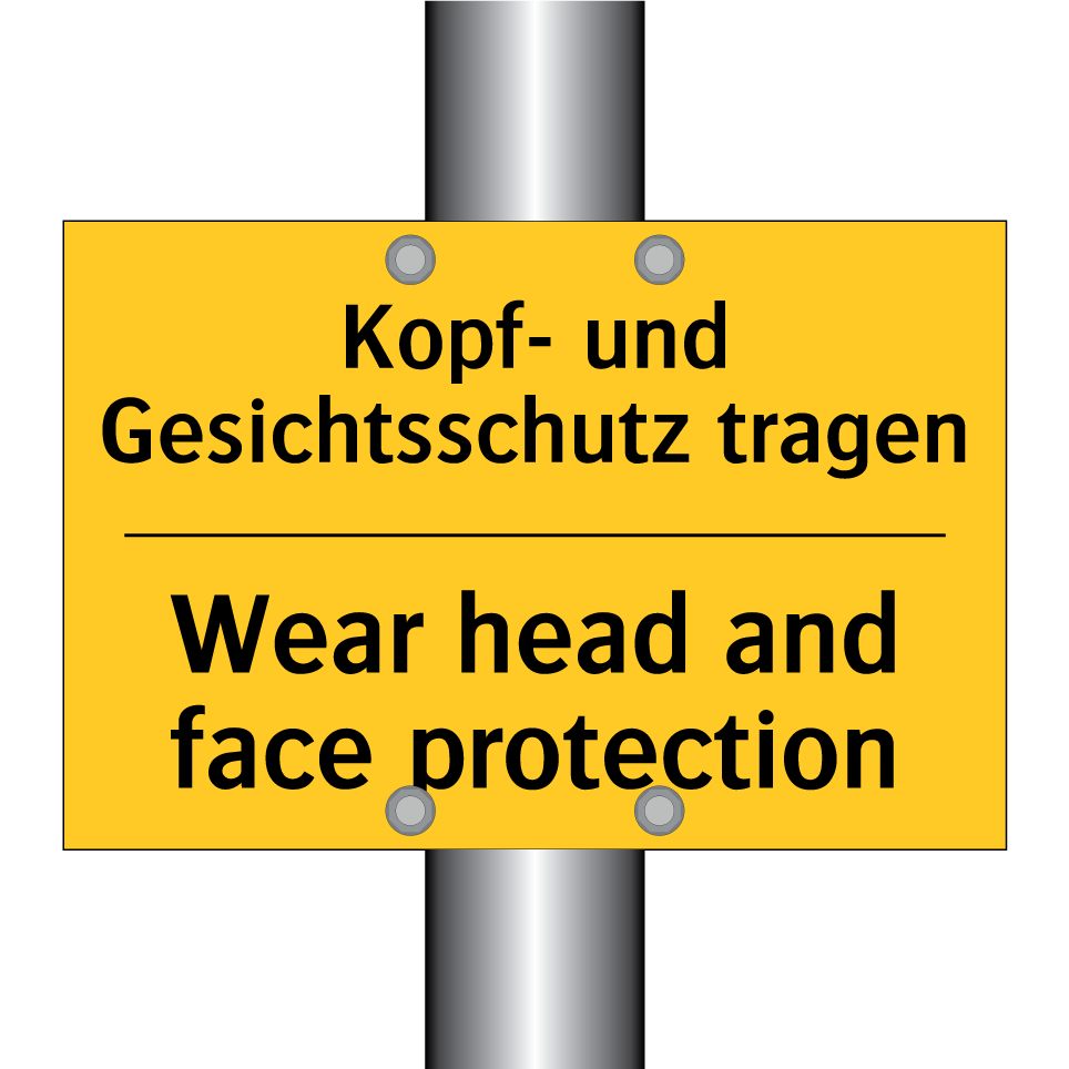 Zweisprachiges Warnschild mit deutschem Text Kopf- und Gesichtsschutz tragen und englischem Text Wear head and face protection