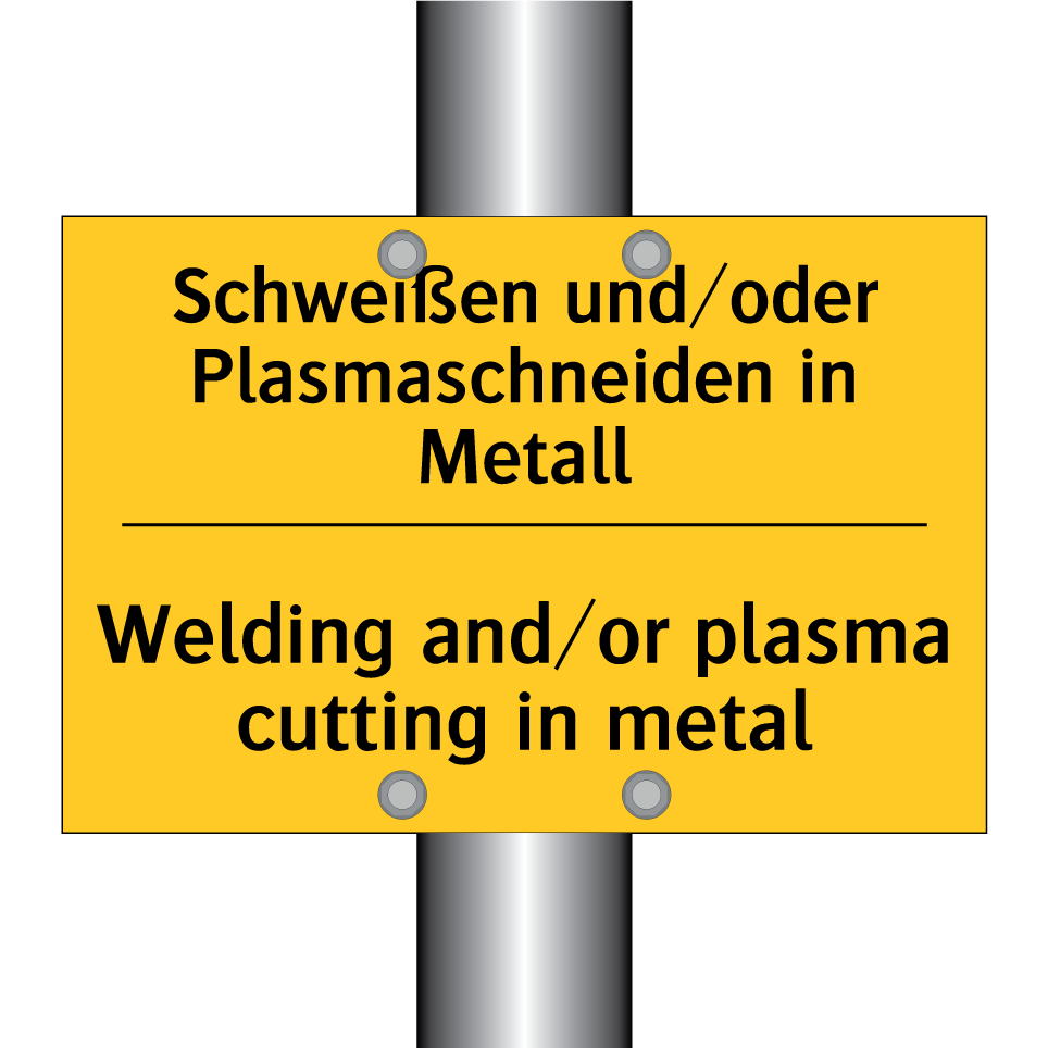 Zweisprachiges Warnschild mit deutschem Text Schweißen und/oder Plasmaschneiden in Metall und englischem Text Welding and/or plasma cutting in metal