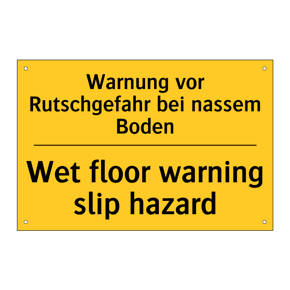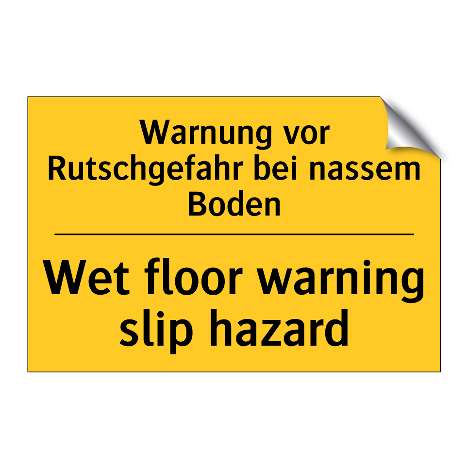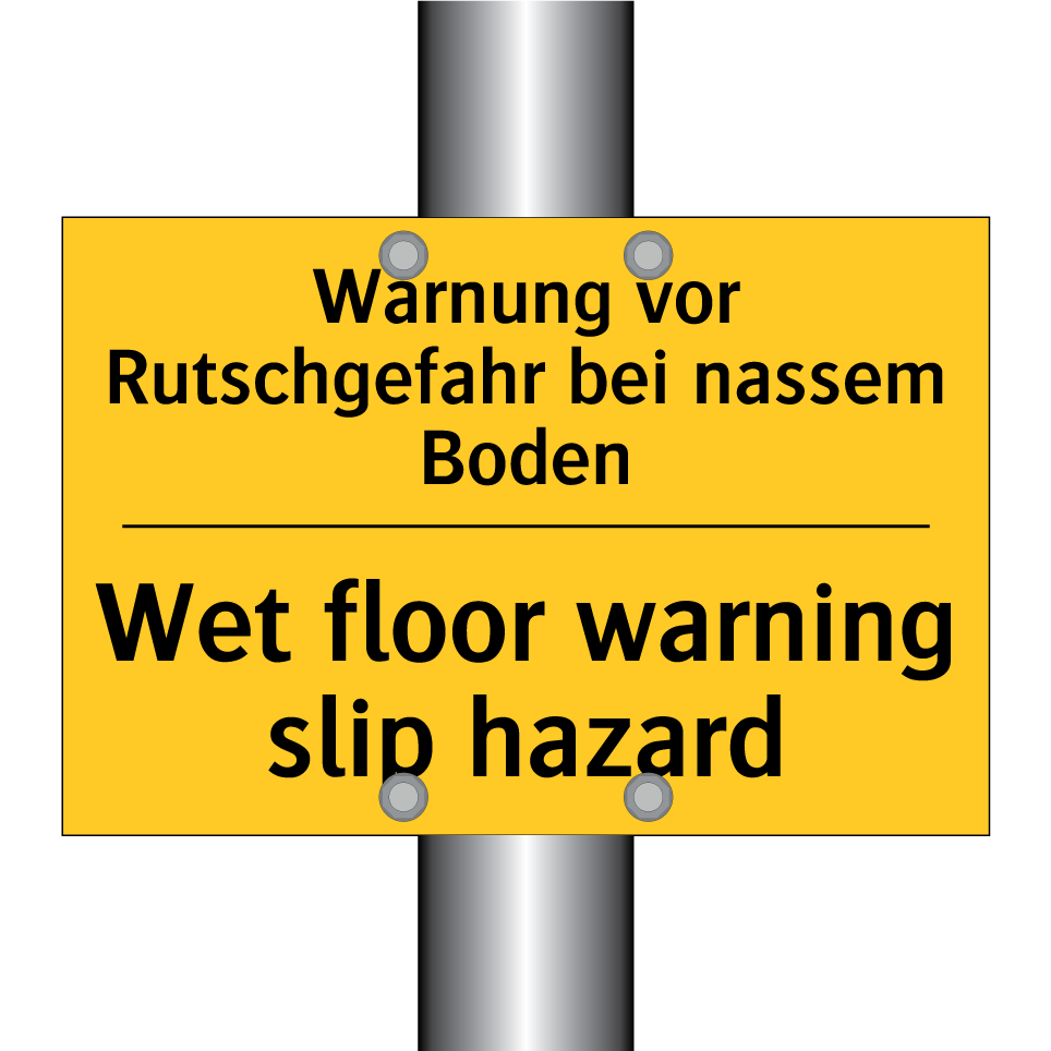 Zweisprachiges Warnschild mit deutschem Text Warnung vor Rutschgefahr bei nassem Boden und englischem Text Wet floor warning slip hazard