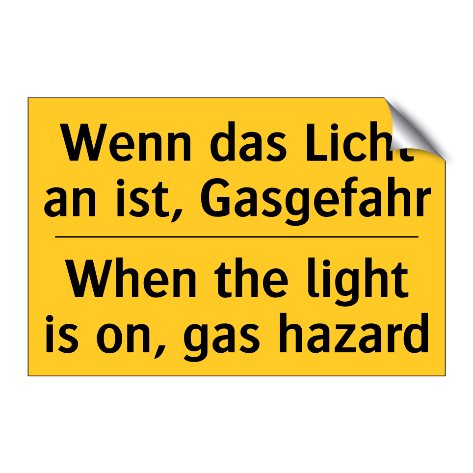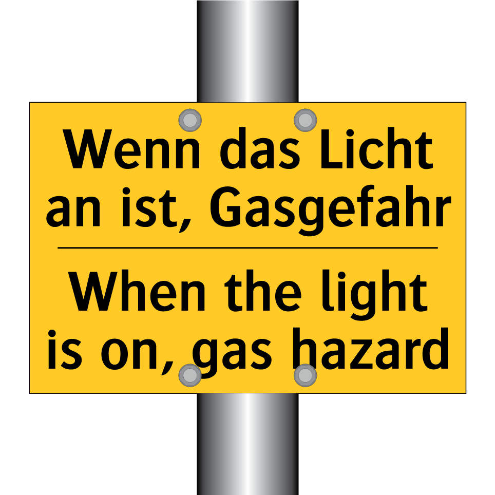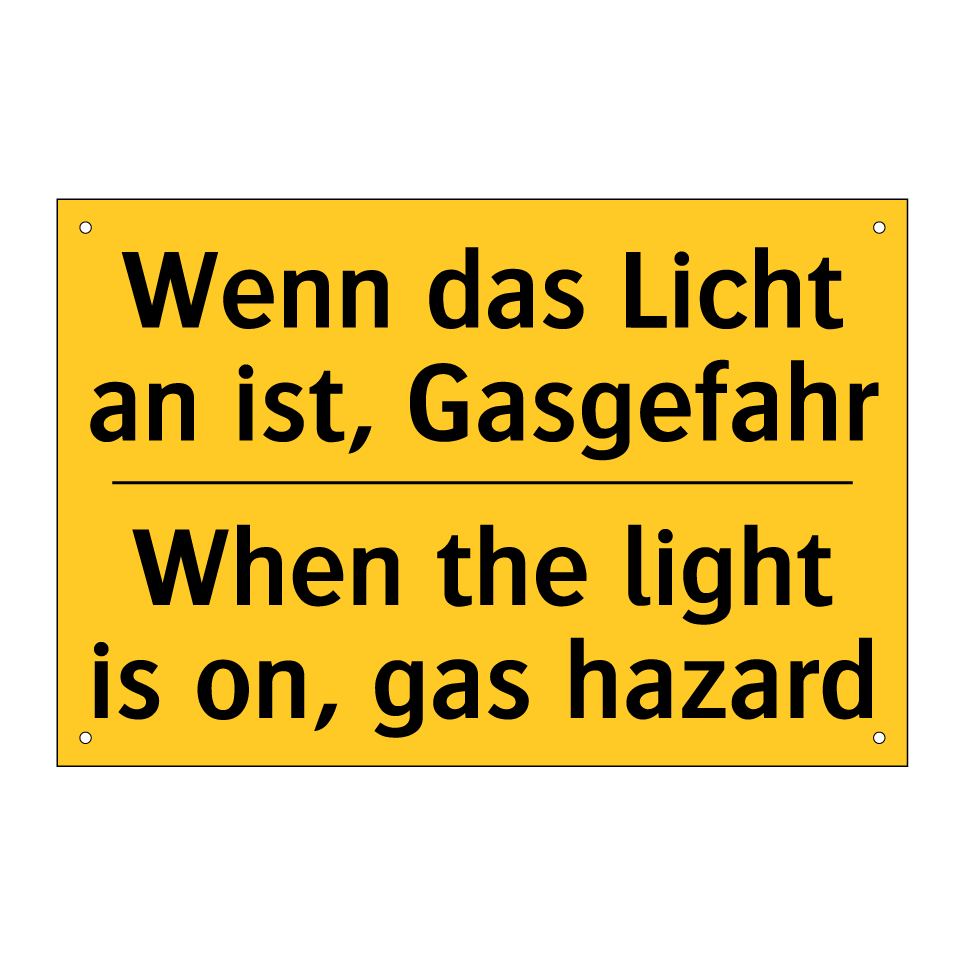 Zweisprachiges Warnschild mit deutschem Text Wenn das Licht an ist, Gasgefahr und englischem Text When the light is on, gas hazard