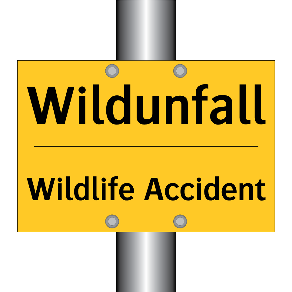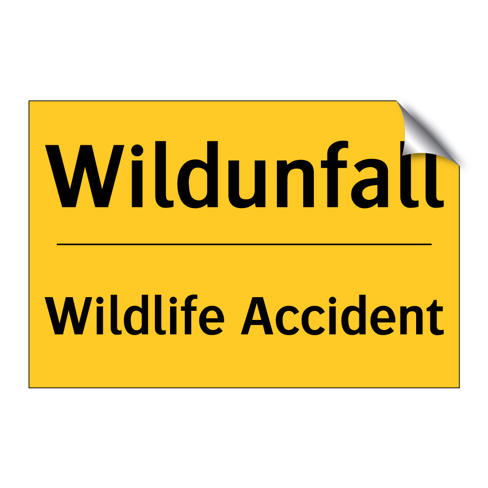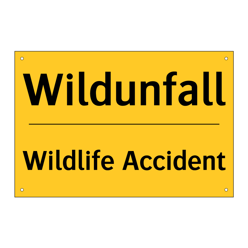 Zweisprachiges Warnschild mit deutschem Text Wildunfall und englischem Text Wildlife Accident