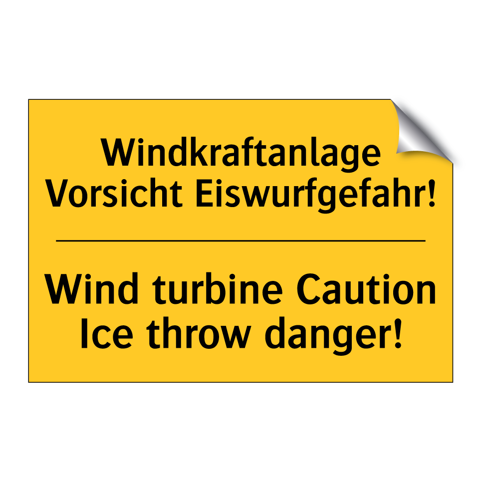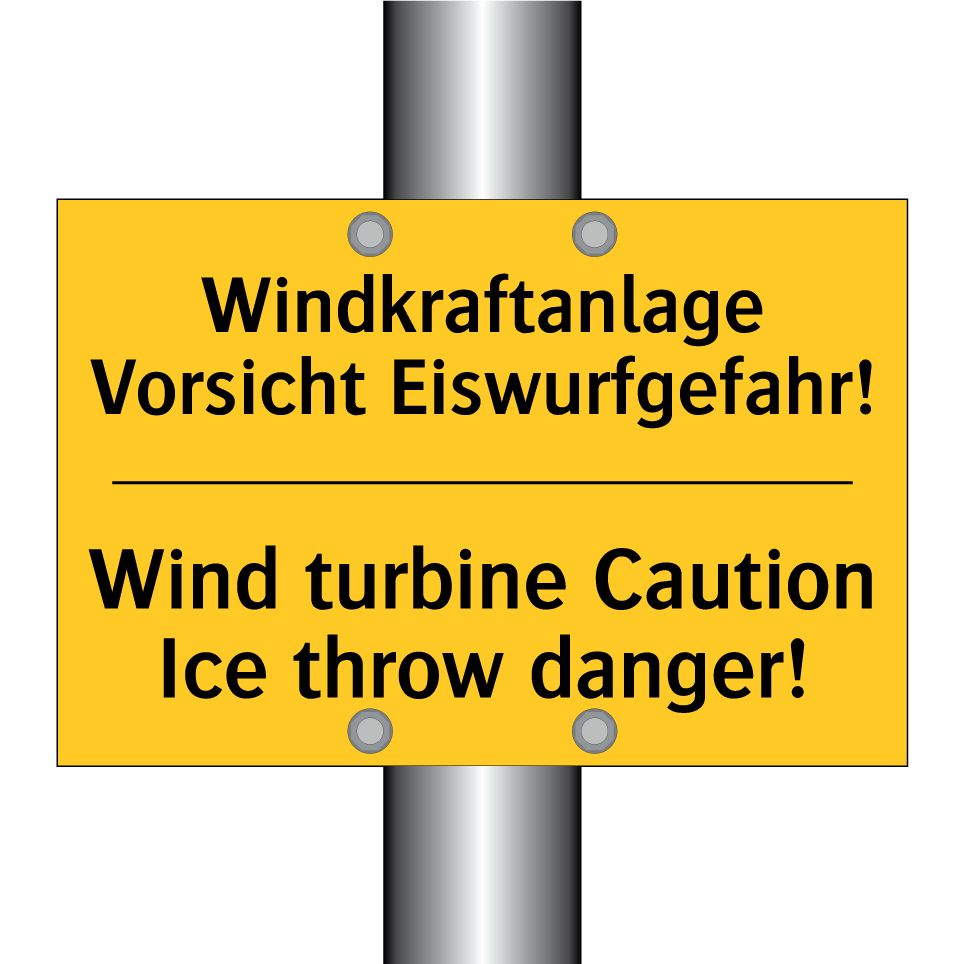 Zweisprachiges Warnschild mit deutschem Text Windkraftanlage Vorsicht Eiswurfgefahr! und englischem Text Wind turbine Caution Ice throw danger!