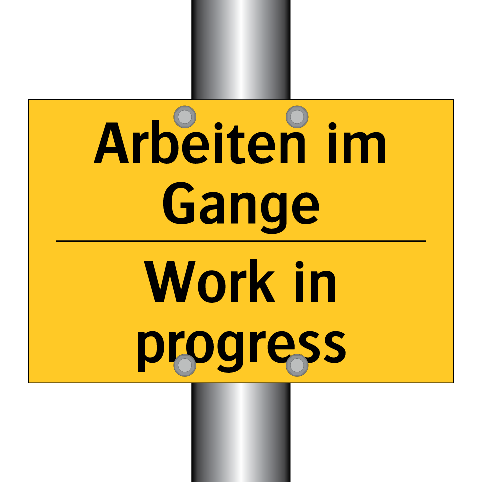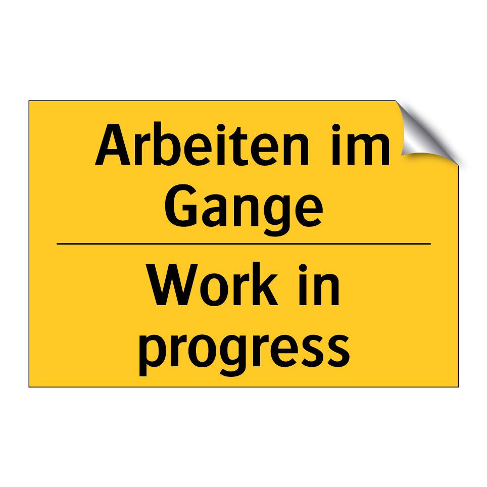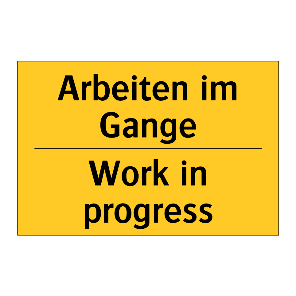Zweisprachiges Warnschild mit deutschem Text Arbeiten im Gange und englischem Text Work in progress