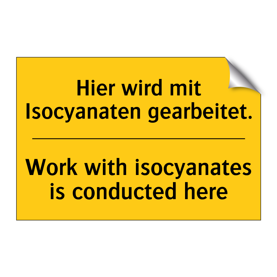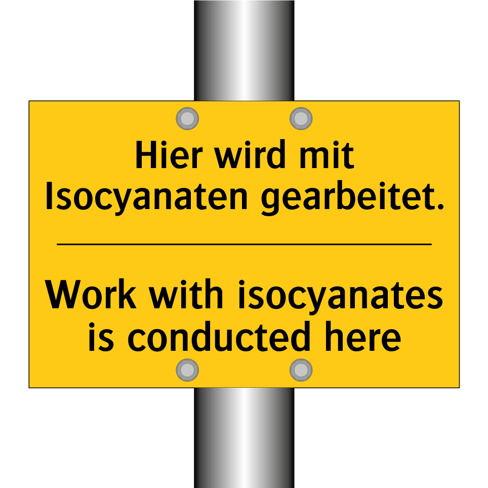 Zweisprachiges Warnschild mit deutschem Text Hier wird mit Isocyanaten gearbeitet. und englischem Text Work with isocyanates is conducted here