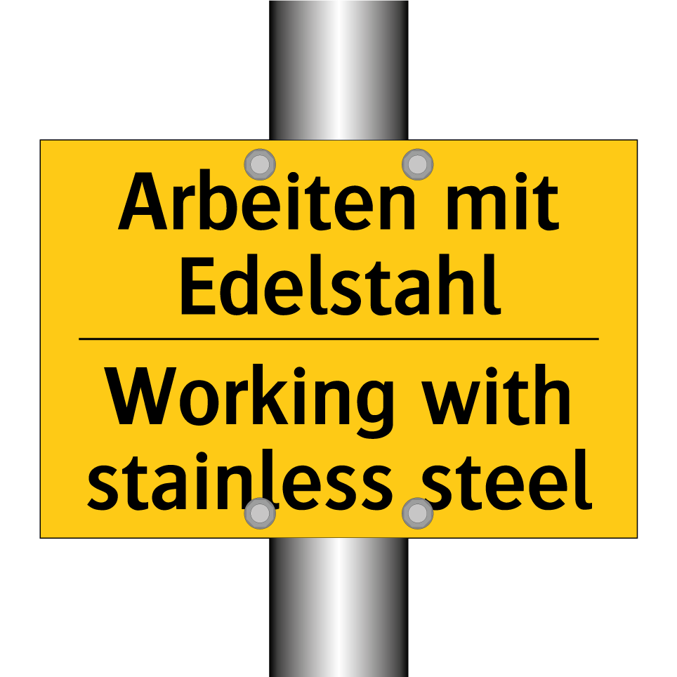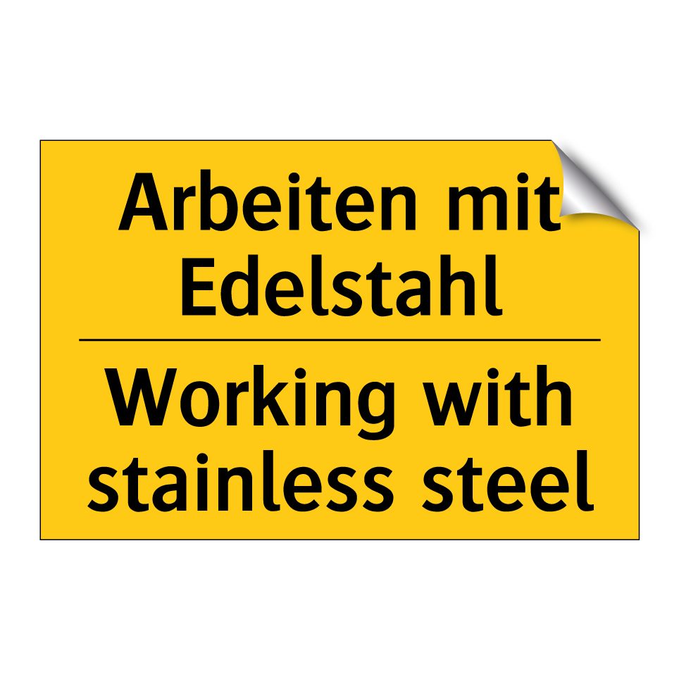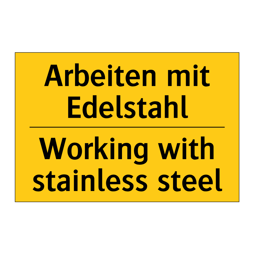 Zweisprachiges Warnschild mit deutschem Text Arbeiten mit Edelstahl und englischem Text Working with stainless steel