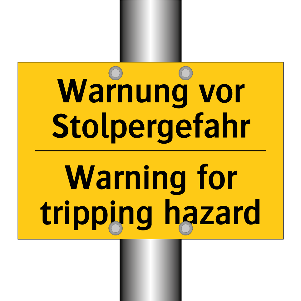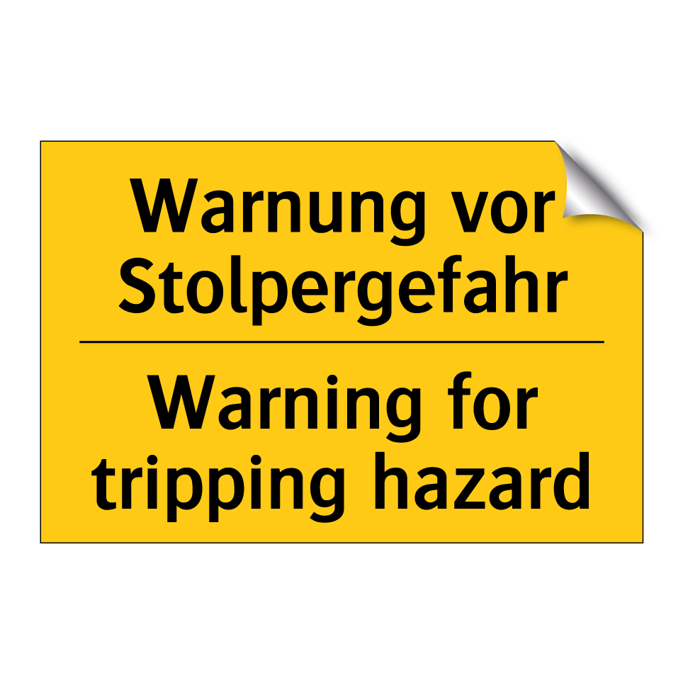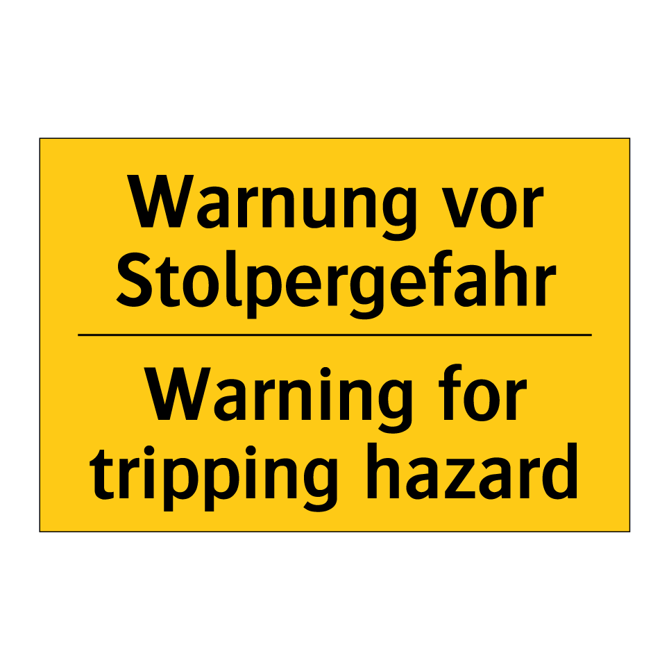 Zweisprachiges Warnschild mit deutschem Text Warnung vor Stolpergefahr und englischem Text Warning for tripping hazard