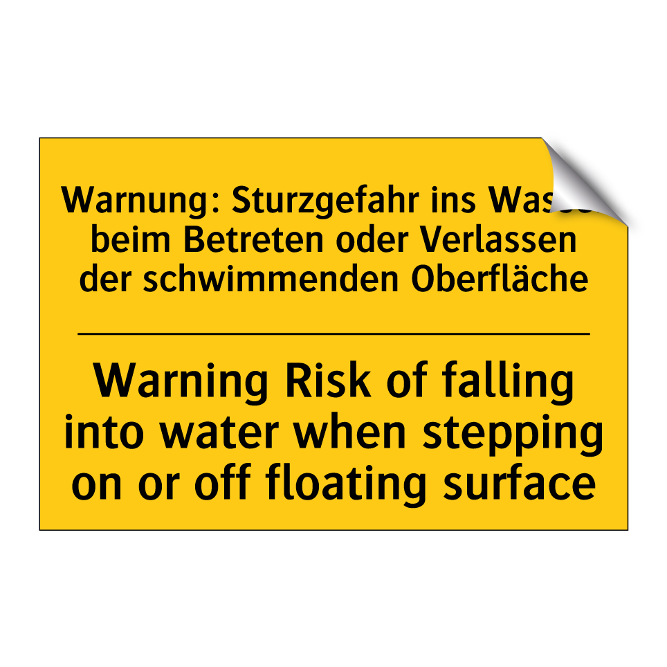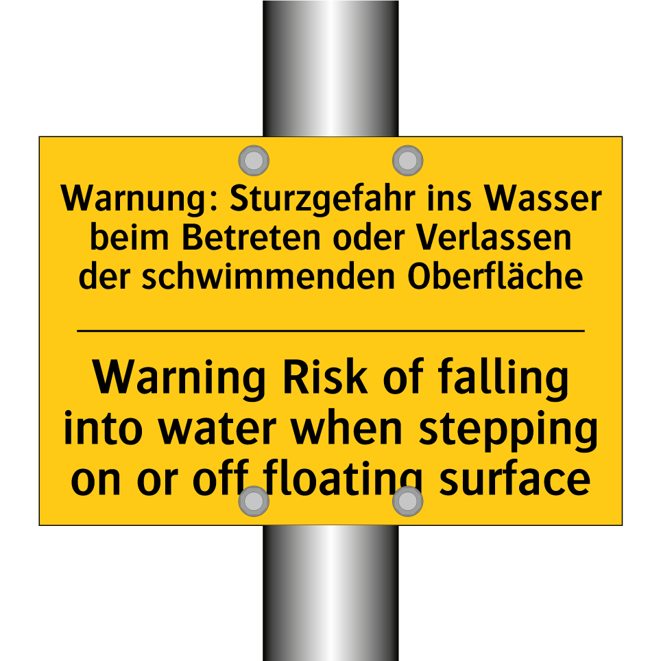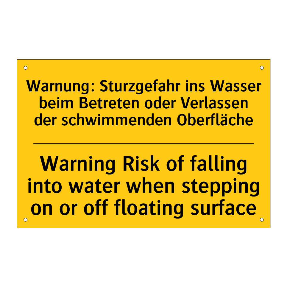 Zweisprachiges Warnschild mit deutschem Text Warnung: Sturzgefahr ins Wasser beim Betreten oder Verlassen der schwimmenden Oberfläche und englischem Text Warning Risk of falling into water when stepping on or off floating surface