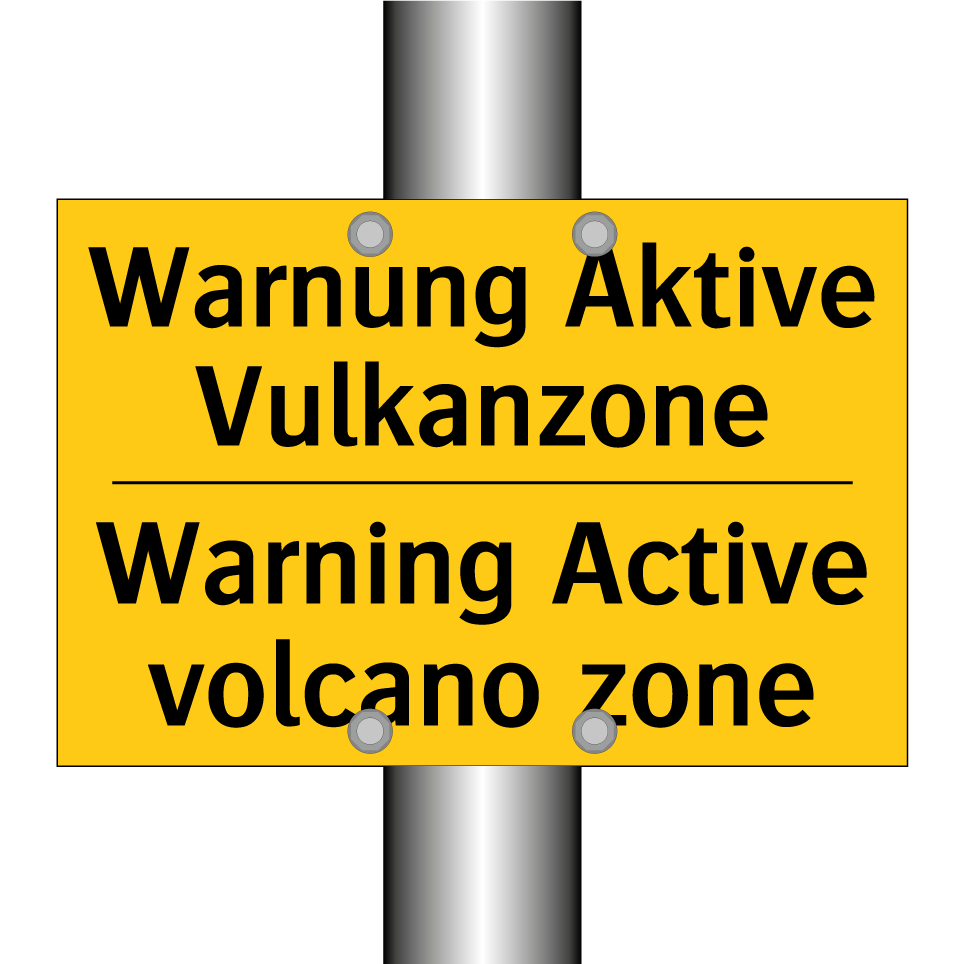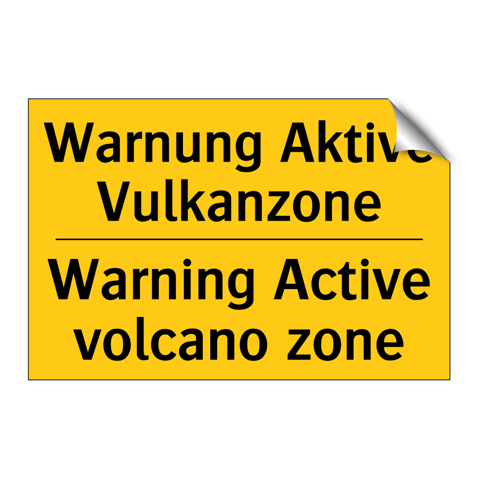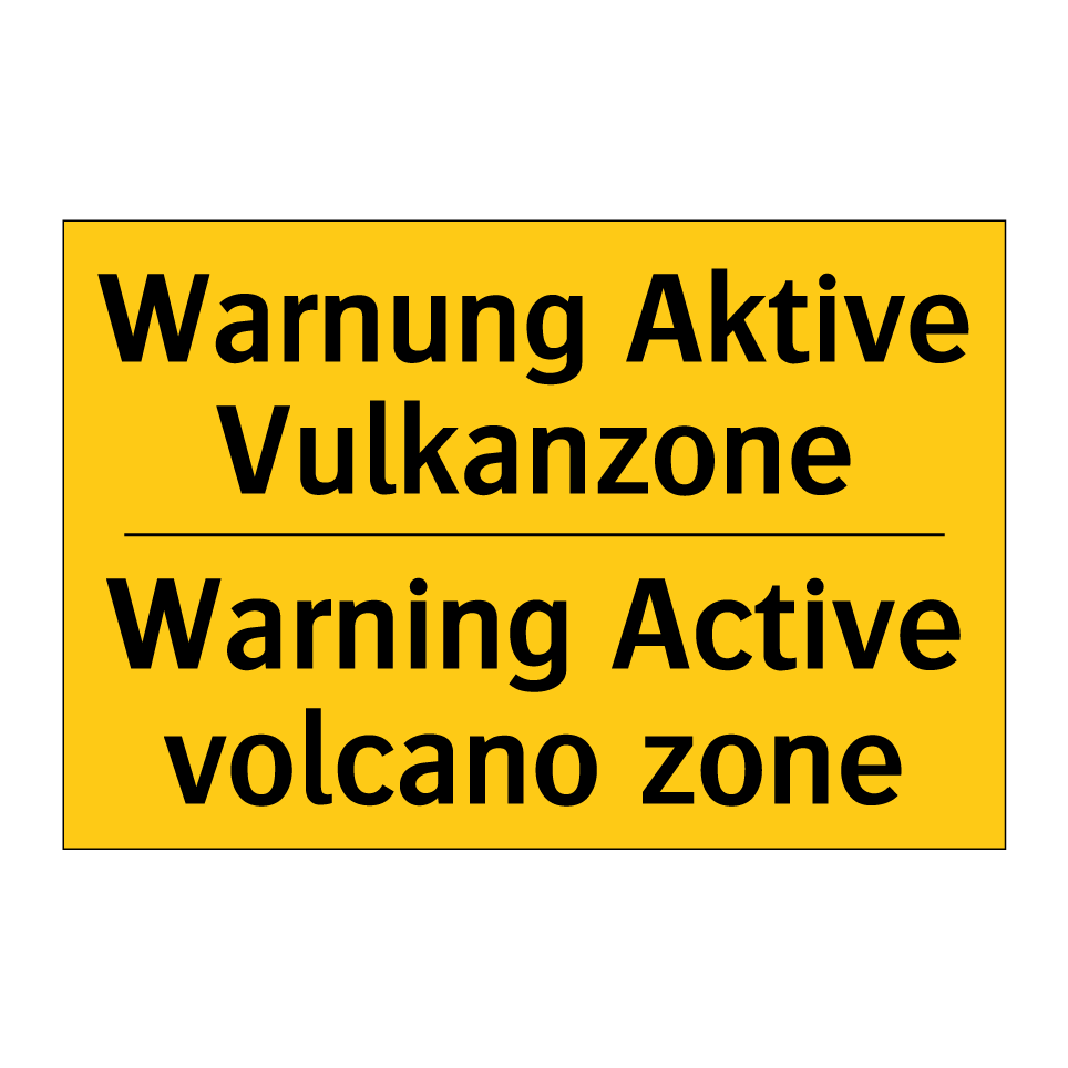 Zweisprachiges Warnschild mit deutschem Text Warnung Aktive Vulkanzone und englischem Text Warning Active volcano zone