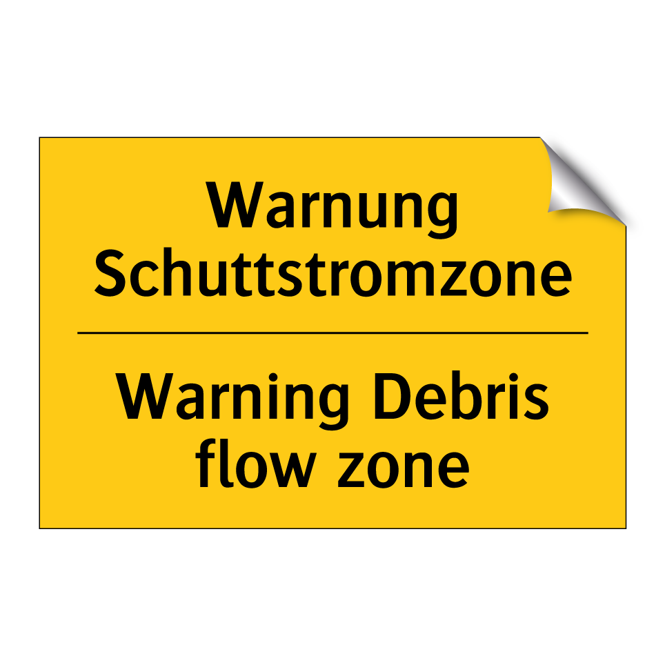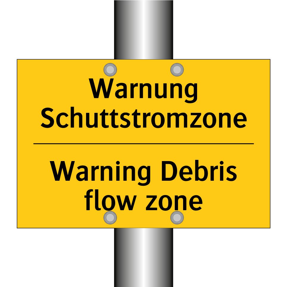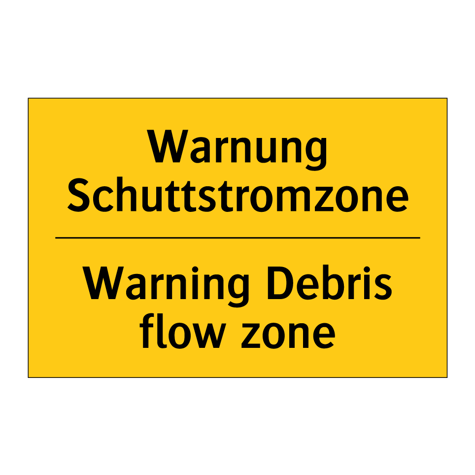Zweisprachiges Warnschild mit deutschem Text Warnung Schuttstromzone und englischem Text Warning Debris flow zone