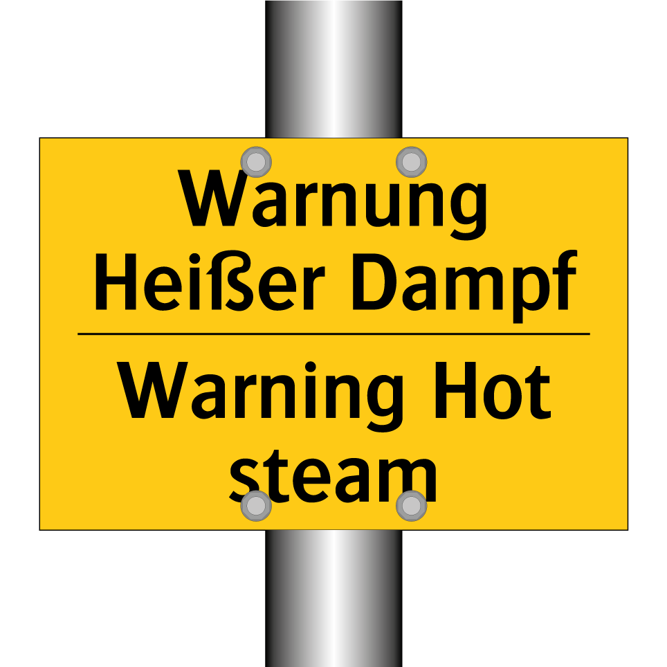 Zweisprachiges Warnschild mit deutschem Text Warnung Heißer Dampf und englischem Text Warning Hot steam