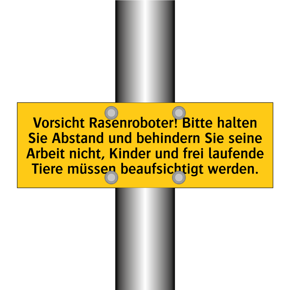 Warnschild mit dem Text Vorsicht Rasenroboter! Bitte halten Sie Abstand und behindern Sie seine Arbeit nicht, Kinder und frei laufende Tiere müssen beaufsichtigt werden.