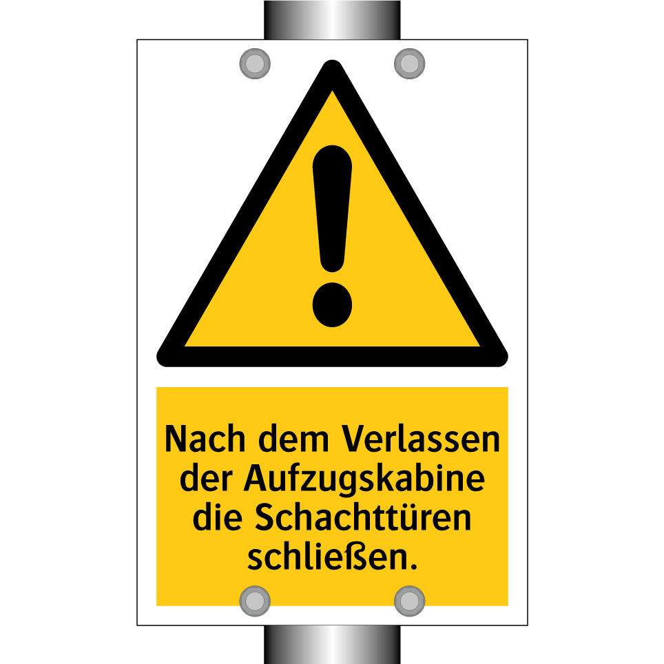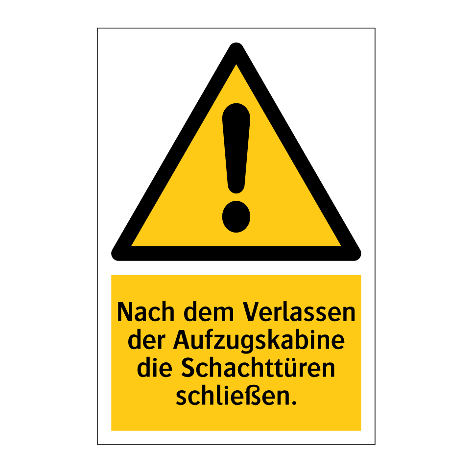 Warnschild mit dem Text Nach dem Verlassen der Aufzugskabine die Schachttüren schließen.