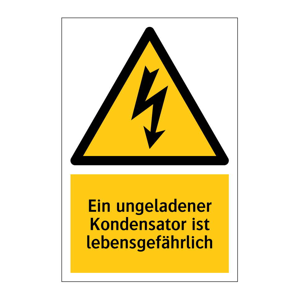 Warnschild mit dem Text Ein ungeladener Kondensator ist lebensgefährlich