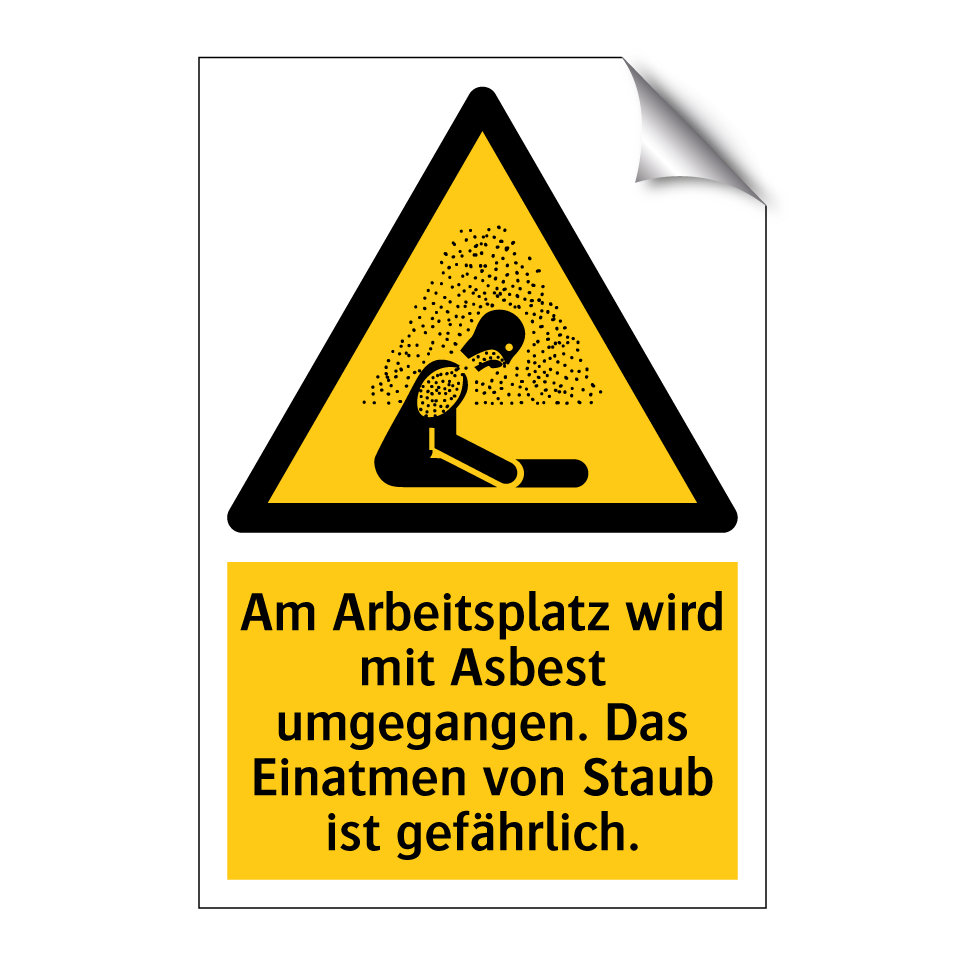 Warnschild mit dem Text Am Arbeitsplatz wird mit Asbest umgegangen. Das Einatmen von Staub ist gefährlich.