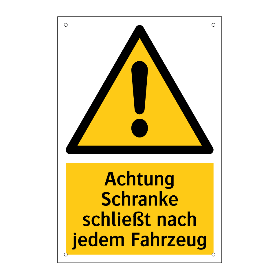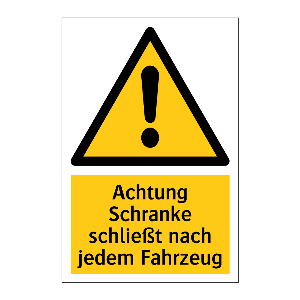 Diese Warnschild ist ideal für den Einsatz in Bereichen, in denen Schranken regelmäßig schließen, wie zum Beispiel in Parkhäusern, an Einfahrten oder auf Firmengeländen. Die auffällige gelbe Hintergrundfarbe und die schwarze Schrift sorgen dafür, dass die Botschaft klar und deutlich wahrgenommen wird. Platzieren Sie das Warnschild an gut sichtbaren Stellen, um Autofahrer rechtzeitig zu warnen und Unfälle zu vermeiden. Es ist besonders nützlich an Orten, an denen der Verkehr geregelt werden muss, um einen reibungslosen Ablauf zu gewährleisten. Diese Warnschilder sind ein unverzichtbares Element für die Sicherheit in Bereichen mit automatischen Schranken.