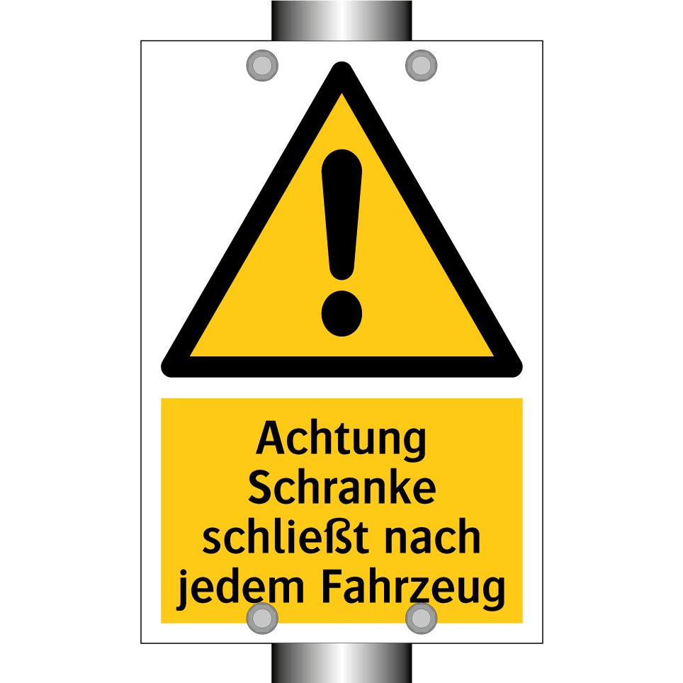 Warnschild mit dem Text Achtung Schranke schließt nach jedem Fahrzeug