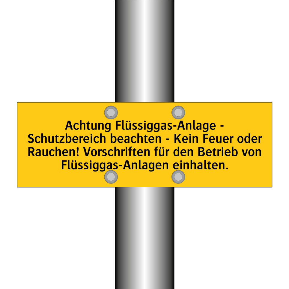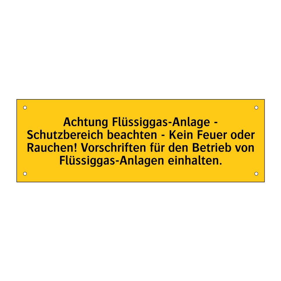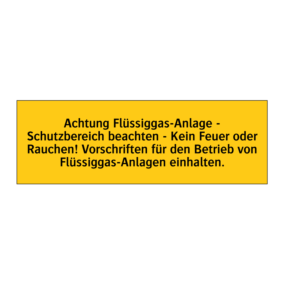 Warnschild mit dem Text Achtung Flüssiggas-Anlage - Schutzbereich beachten - Kein Feuer oder Rauchen! Vorschriften für den Betrieb von Flüssiggas-Anlagen einhalten.