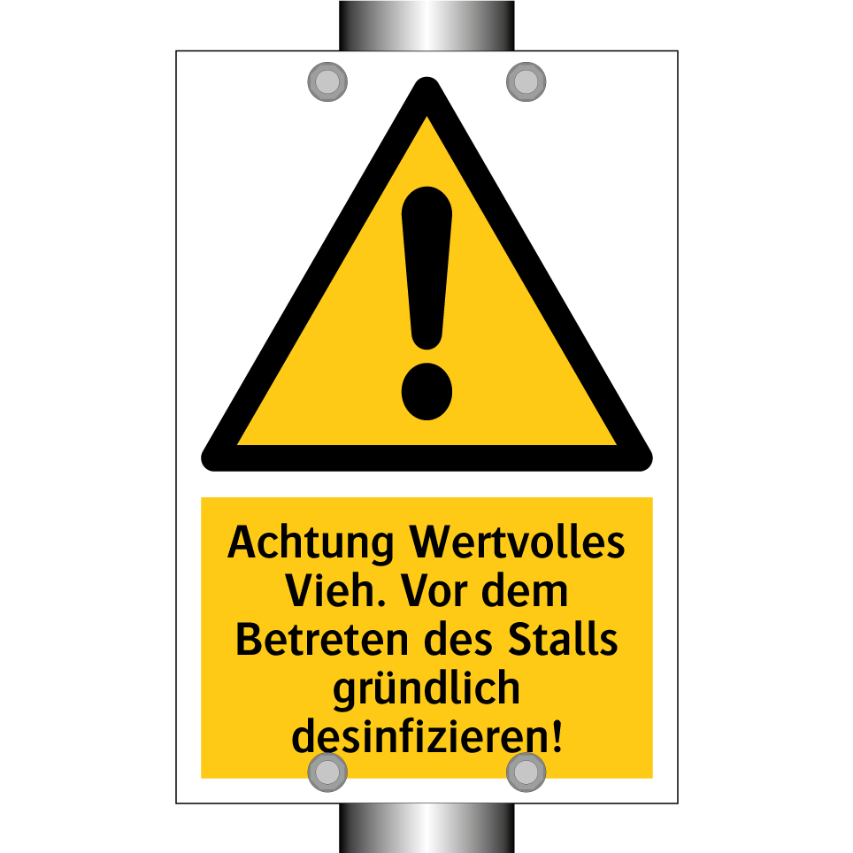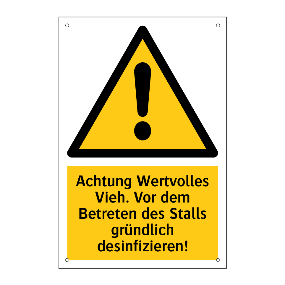 Warnschild mit dem Text Achtung Wertvolles Vieh. Vor dem Betreten des Stalls gründlich desinfizieren!