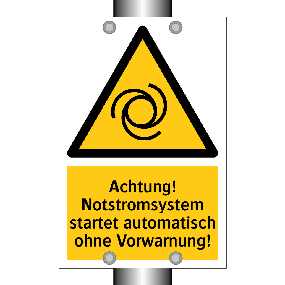 Warnschild mit dem Text Achtung! Notstromsystem startet automatisch ohne Vorwarnung!