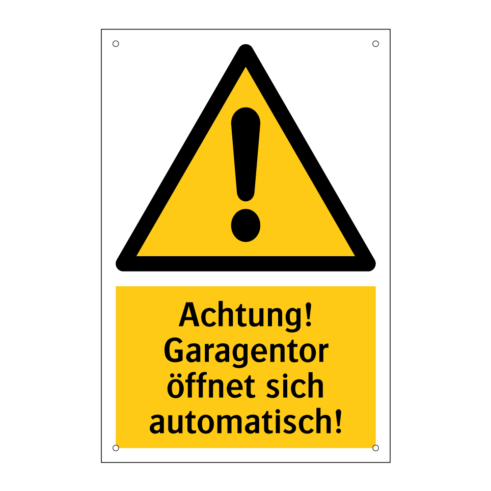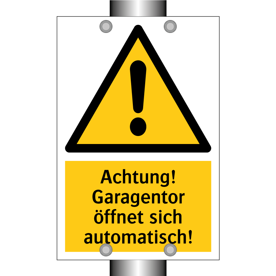 Warnschild mit dem Text Achtung! Garagentor öffnet sich automatisch!