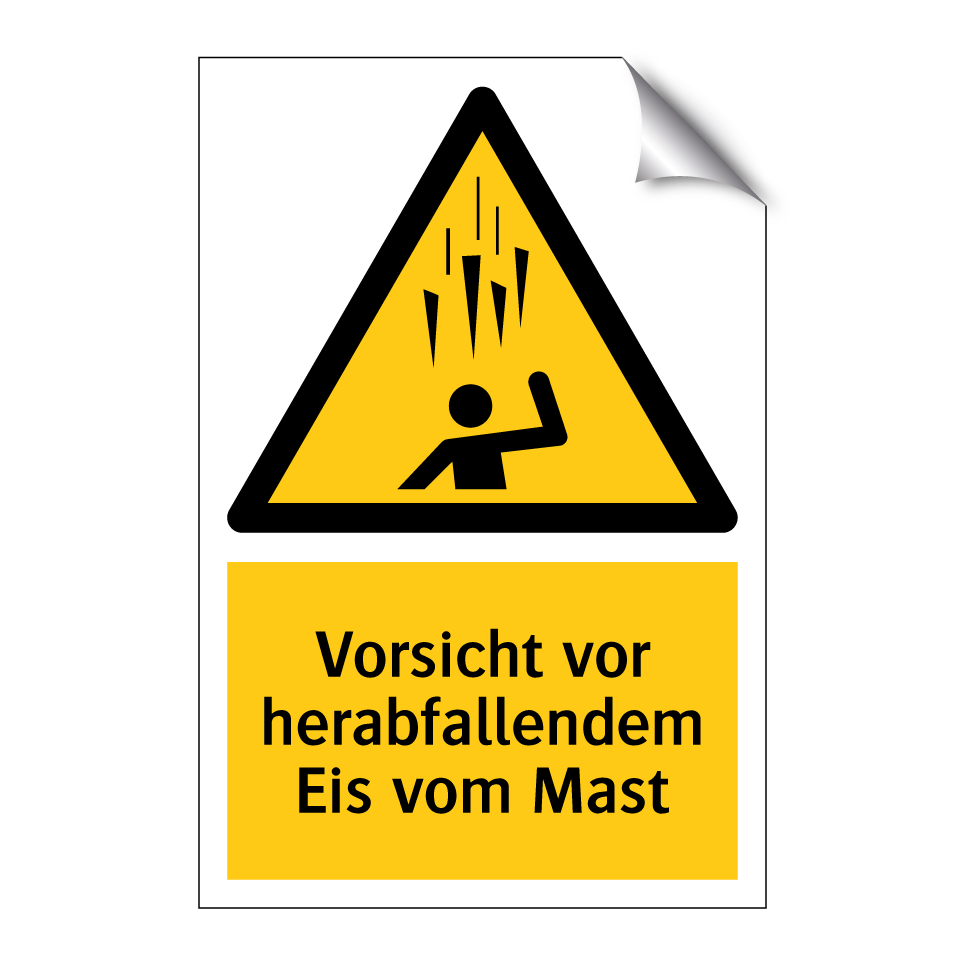 Warnschild mit dem Text Vorsicht vor herabfallendem Eis vom Mast