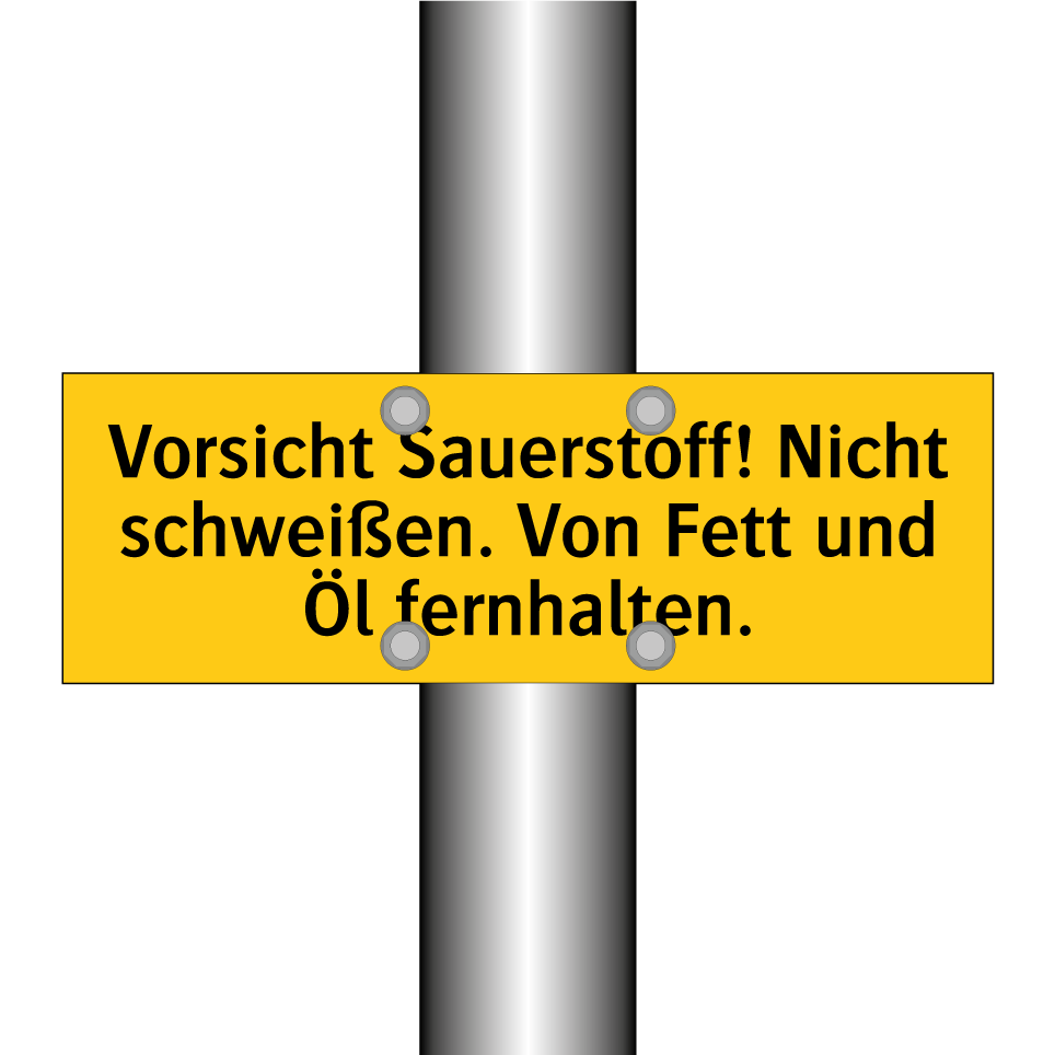 Warnschild mit dem Text Vorsicht Sauerstoff! Nicht schweißen. Von Fett und Öl fernhalten.