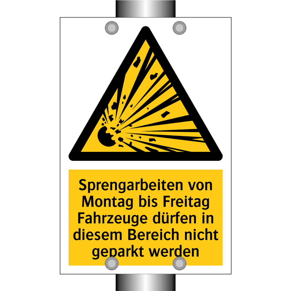 Warnschild mit dem Text Sprengarbeiten von Montag bis Freitag Fahrzeuge dürfen in diesem Bereich nicht geparkt werden
