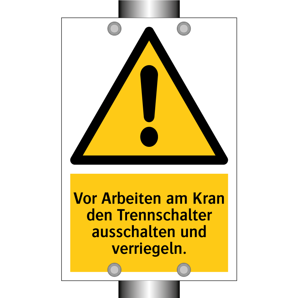 Warnschild mit dem Text Vor Arbeiten am Kran den Trennschalter ausschalten und verriegeln.