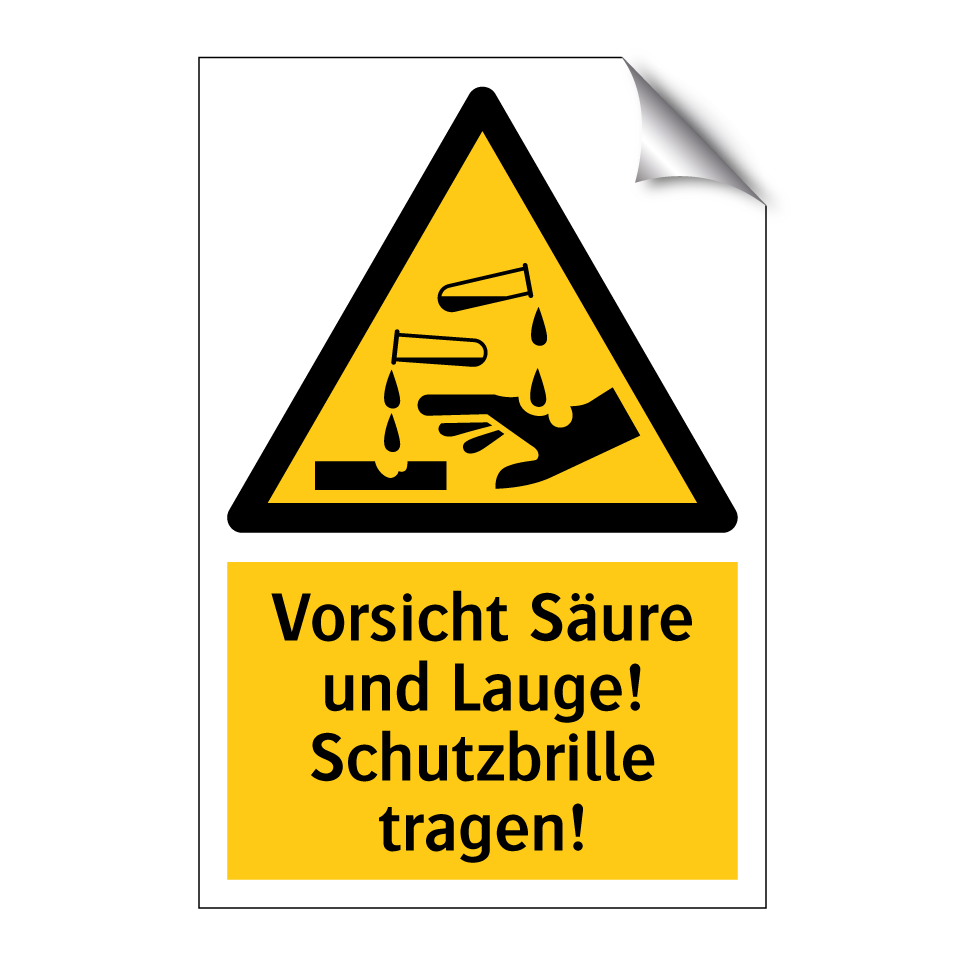 Warnschild mit dem Text Vorsicht Säure und Lauge! Schutzbrille tragen!